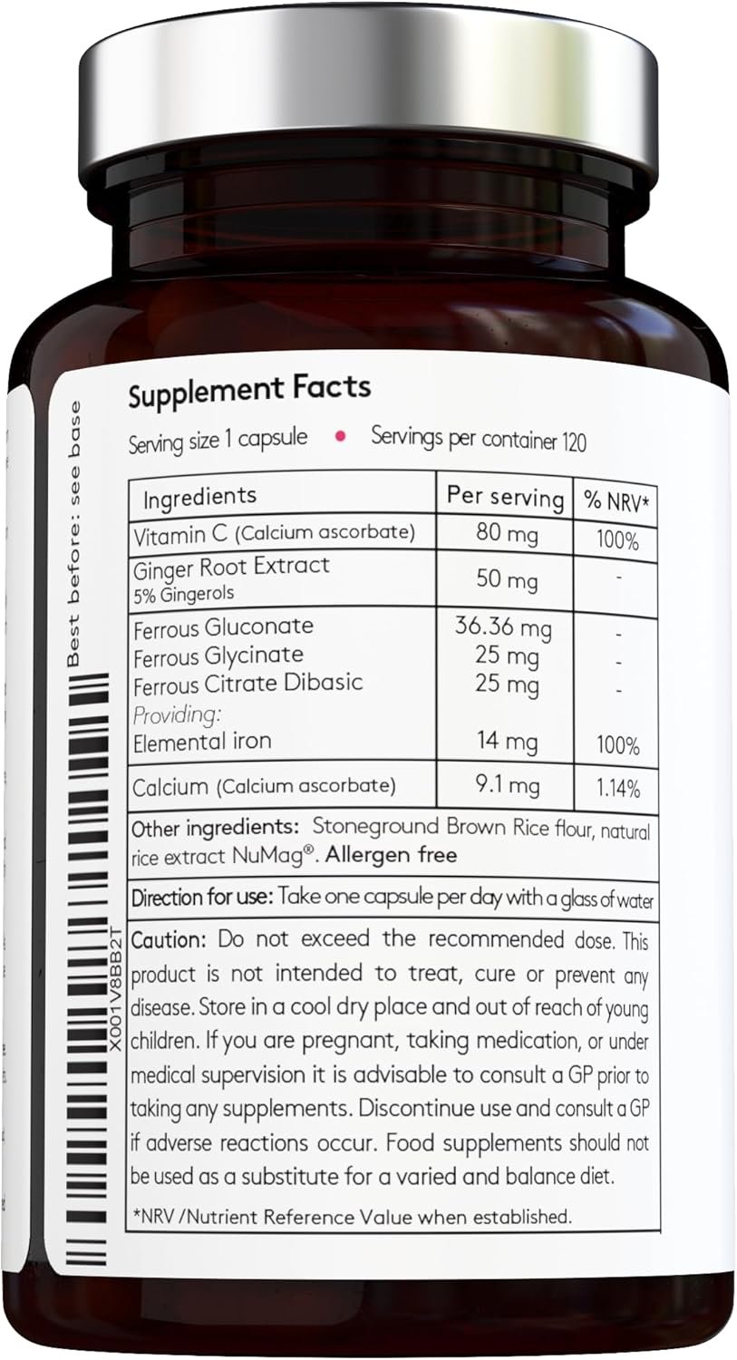 Iron Supplement – Ferrous Glycinate + Citrate + Gluconate and Non-Acid VIT C with Ginger – UK Made