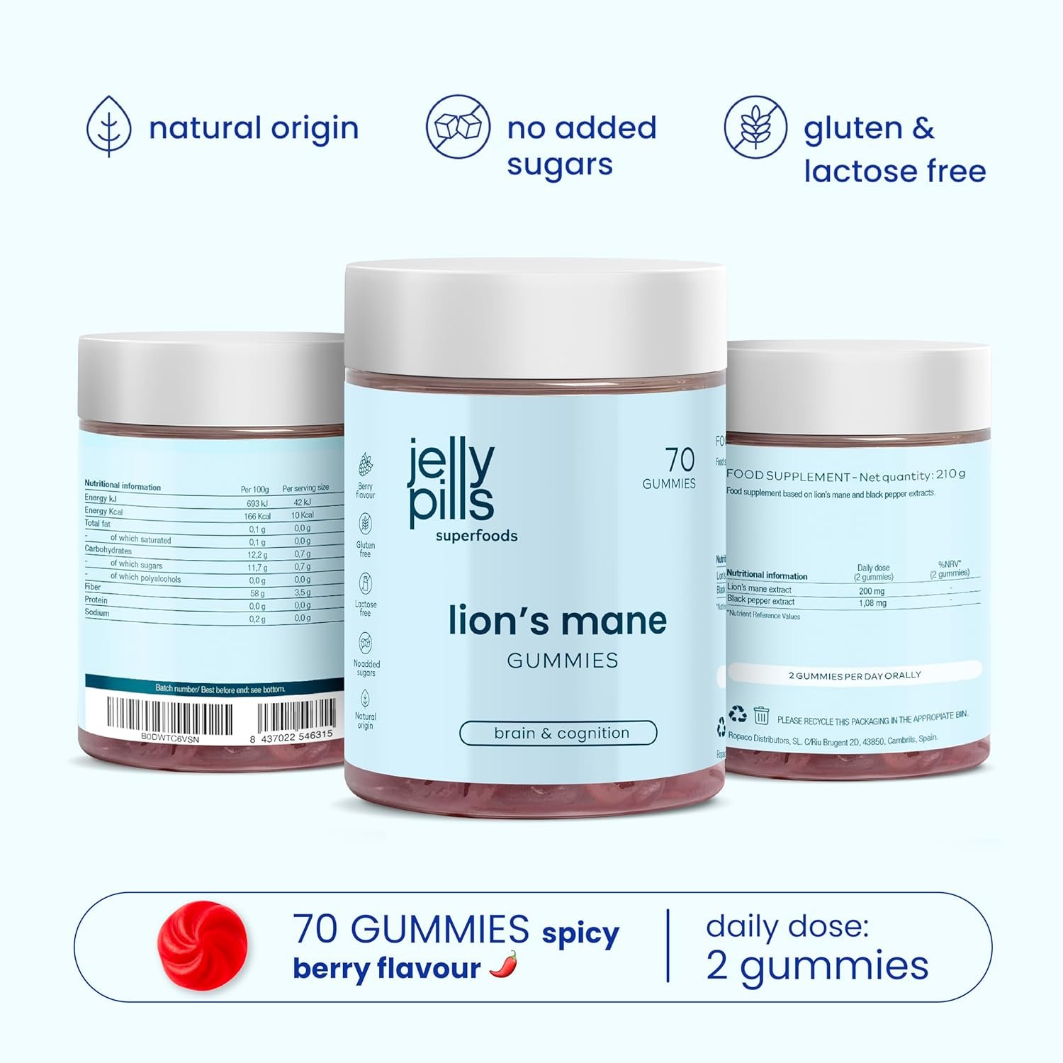 Jelly Pills Lion’s Mane + Black Pepper Gummies – 70 Vegan Gummies – No Added Sugars – Berry Flavor – Cognitive & Memory Support