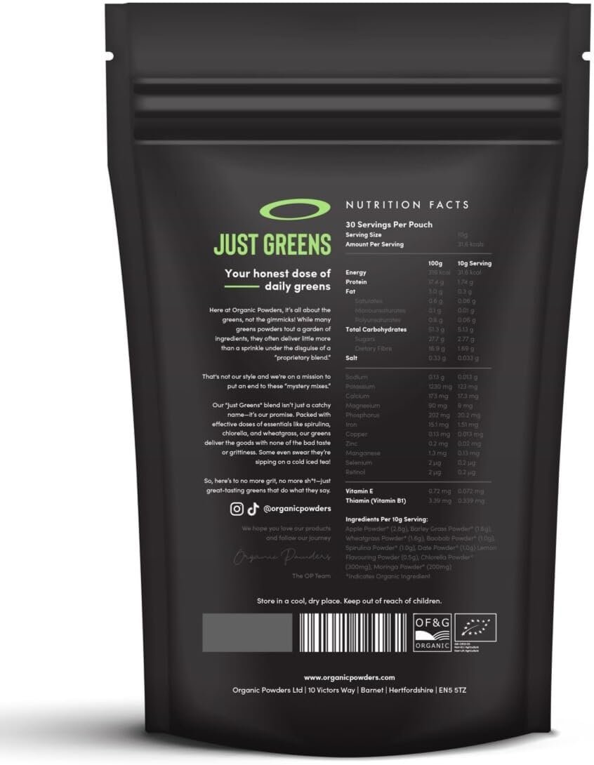 Fuel your body with the power of nature. Organic Powders Just Greens Blend is a premium super greens powder made with only 8 carefully selected organic ingredients: spirulina, chlorella, wheatgrass, barley grass, moringa, baobab, apple powder and date powder, finished with a refreshing hint of natural lemon. This super greens blend is designed to deliver essential vitamins, minerals, antioxidants, and plant-based nutrients in one convenient scoop. Whether you’re looking to support energy, digestion, immunity, detox, or overall wellness, this is the best greens powder to add to your daily routine. Unlike other products that rely on artificial sweeteners or fillers, our organic greens powder is 100% natural, vegan-friendly and certified organic, free from gluten, dairy, GMOs, and unnecessary additives. Just one serving a day helps bridge nutritional gaps, making it easy to stay on track with your health goals. With 30 servings per pouch, this green superfood supplement is perfect for mixing into smoothies, shakes, or water for a quick, nutrient-rich boost. Convenient, clean and delicious. Organic Powders Just Greens Blend is your daily shortcut to better health. Please note: Product packaging may vary slightly from images shown.