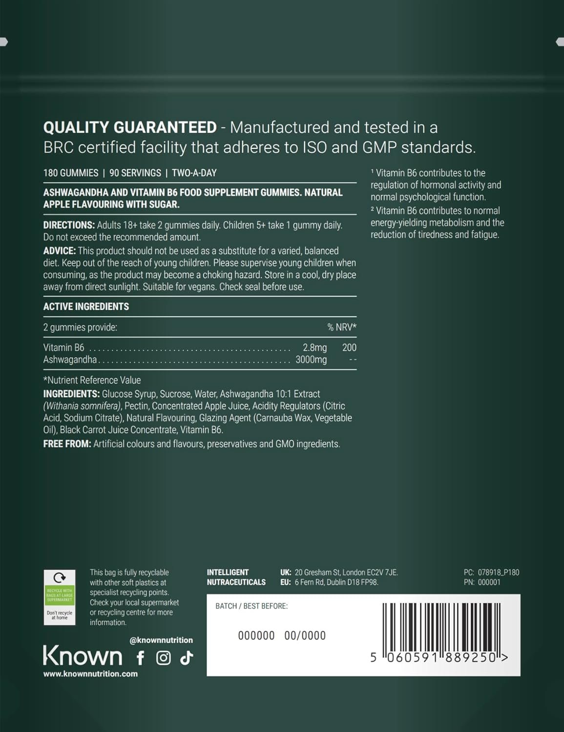 3000MG ASHWAGANDHA – Ashwagandha Gummies by Known Nutrition contain the equivelant of 3000mg Ashwagandha with added Vitamin B6. Ashwagandha is a natural, plant-based Vegan Food Supplement that comes from the root of the Ashwagndha plant.