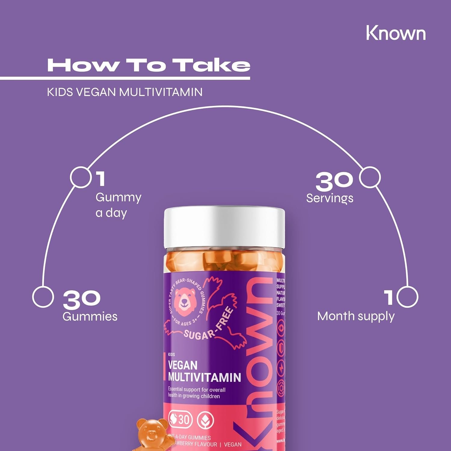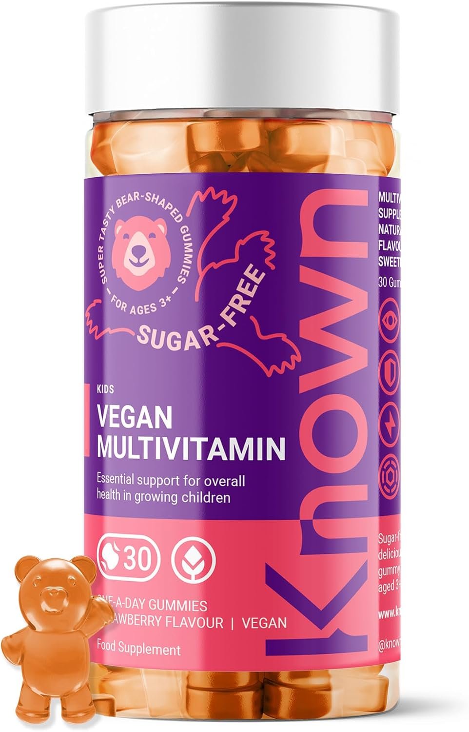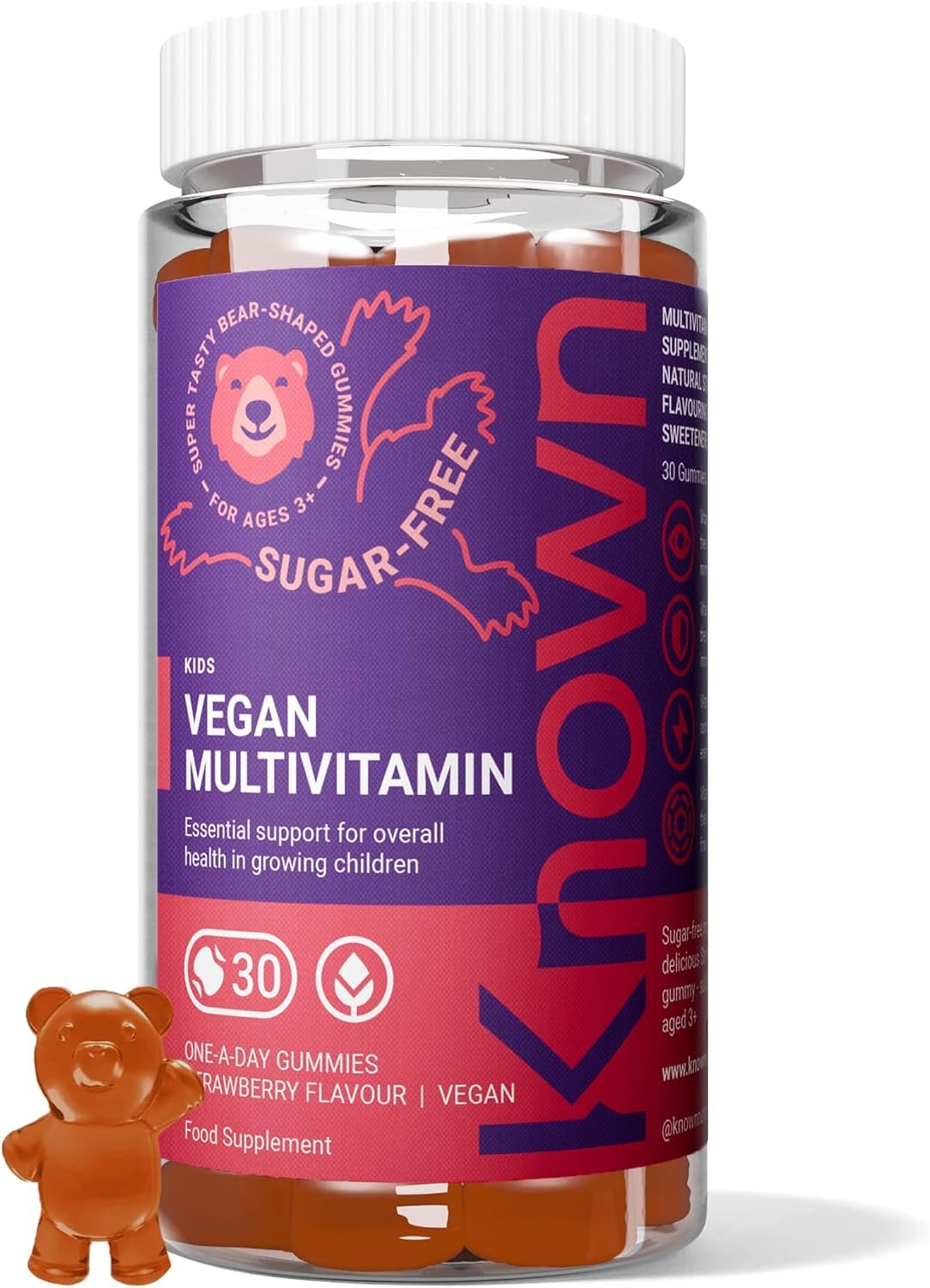 Known Kids Multivitamin Complex Gummies – Sugar-Free – Vitamin C, B6 – Immune Support – Natural Strawberry Flavour – 30 Vegan Gummies, 1 Month Supply