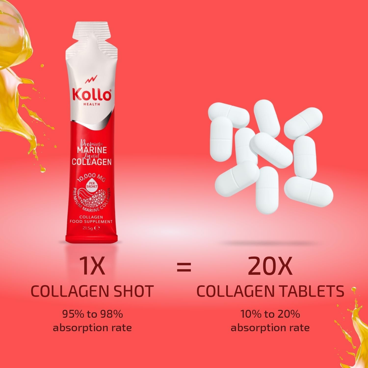 KOLLO PREMIUM MARINE COLLAGEN LIQUID SACHETS – Each 21.5g sachet of Kollo, contains 10,000mg of clinically tested marine collagen and is created to give your body the nutrients it needs from the inside out