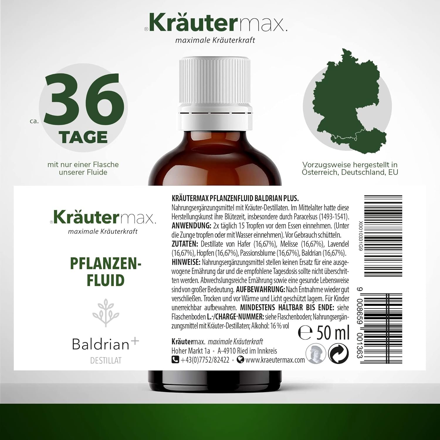 Kräutermax – Plant Fluid Valerian+ – Distillate in Glass – Vegan – Sustainable Packaging Thanks to Amber Glass Bottle – 50 ml