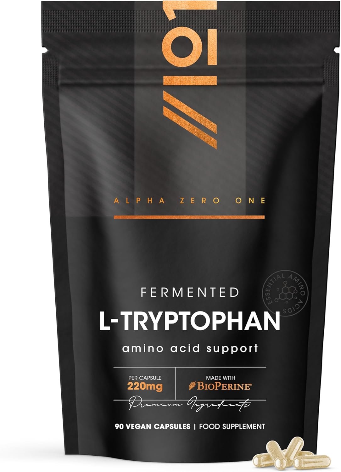 L-Tryptophan 220mg with BioPerine® – 90 Vegan Capsules – Naturally Fermented L-Tryptophan Supplement with Black Pepper Extract for Increased Bioavailability – 3 Months Supply – by Alpha01