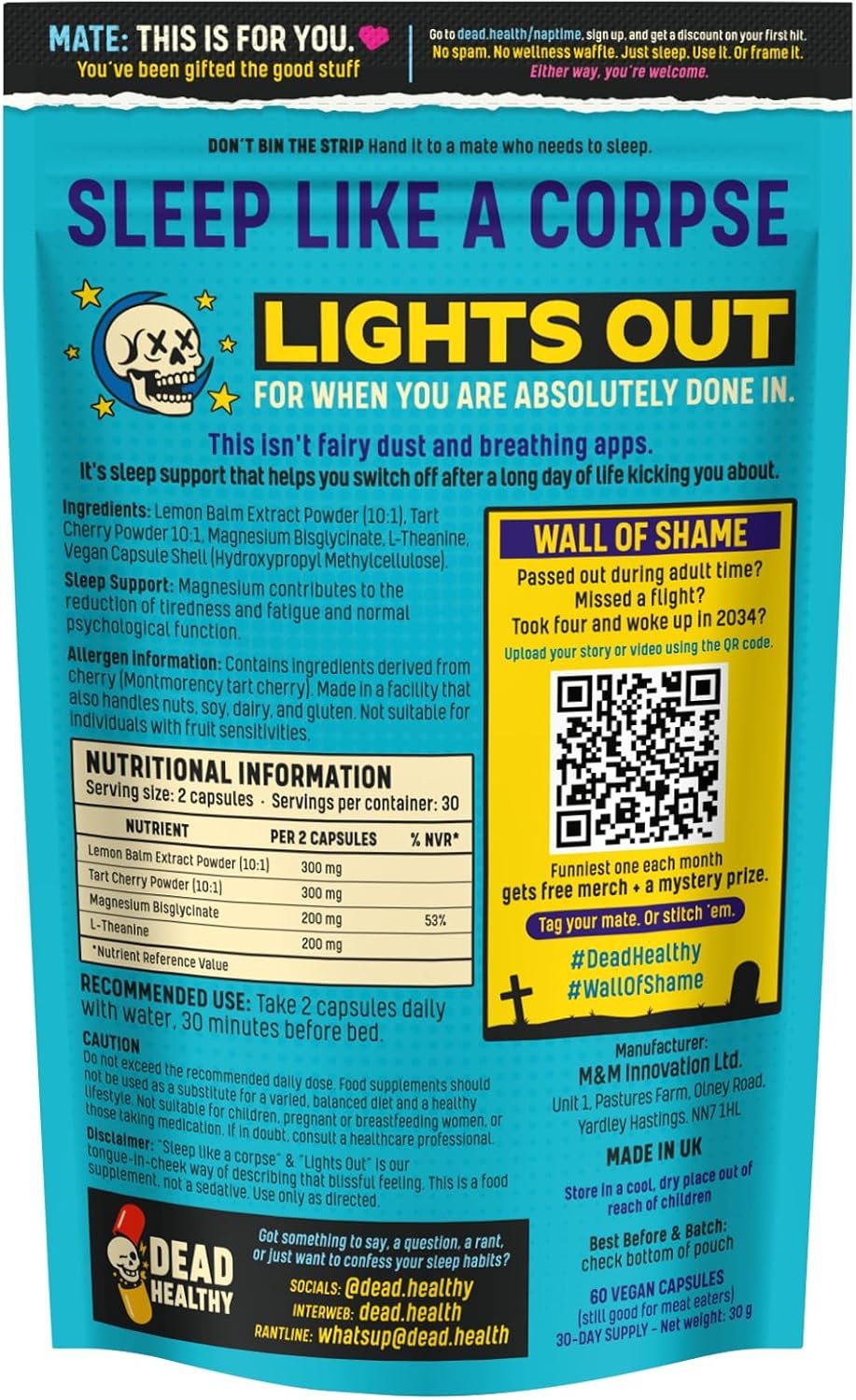 Lights Out by Dead Healthy is a night-time food supplement made with a focused blend of Lemon Balm, L-Theanine, Tart Cherry, and Magnesium.