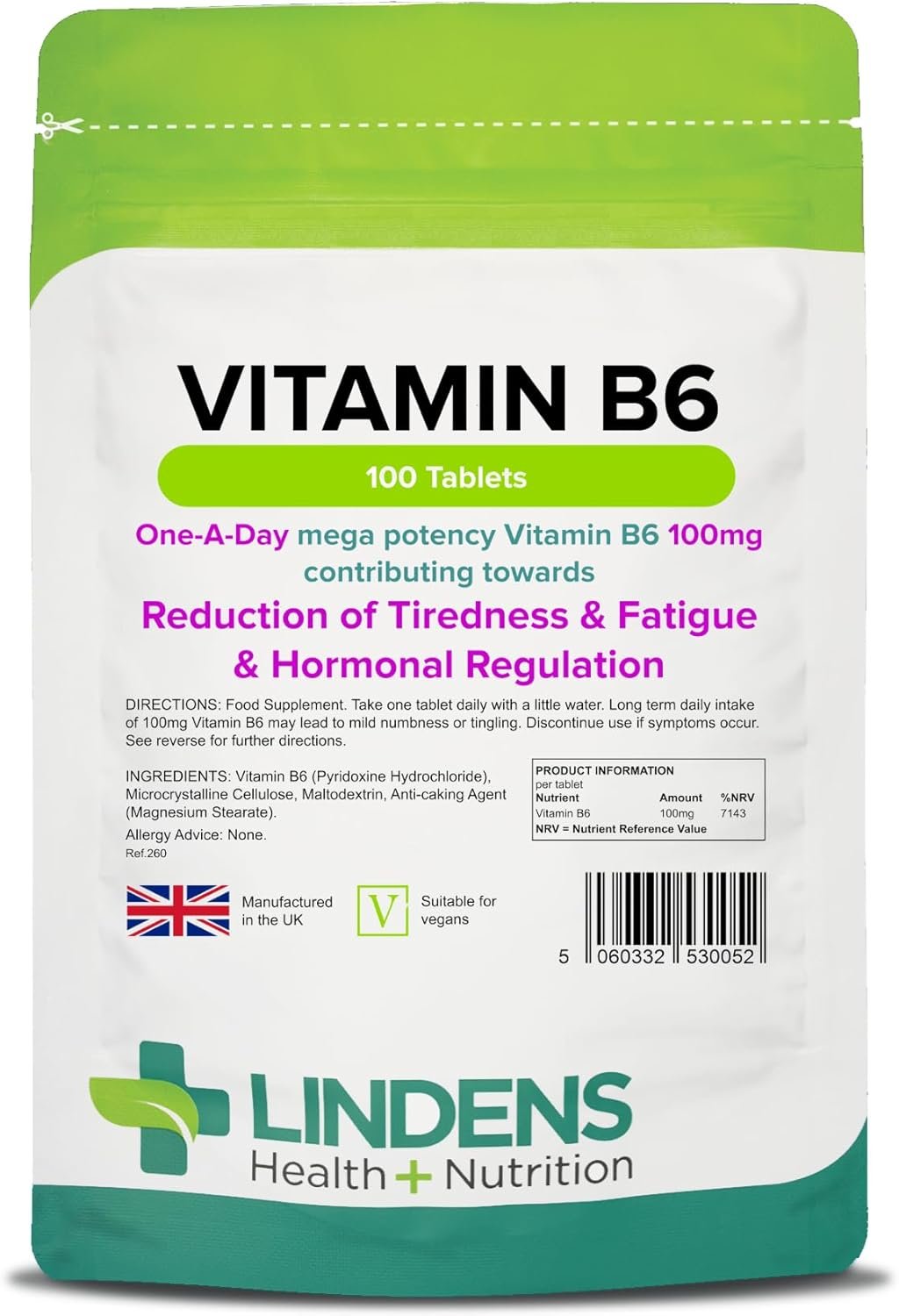 Lindens – Vitamin B6 100mg Tablets – 100 Pack – Ultra-Potent 7000% Nrv Contributes to Healthy Metabolism, Reduction of Tiredness, Normal Immune & Nervous System Function – UK Made, Letterbox Friendly