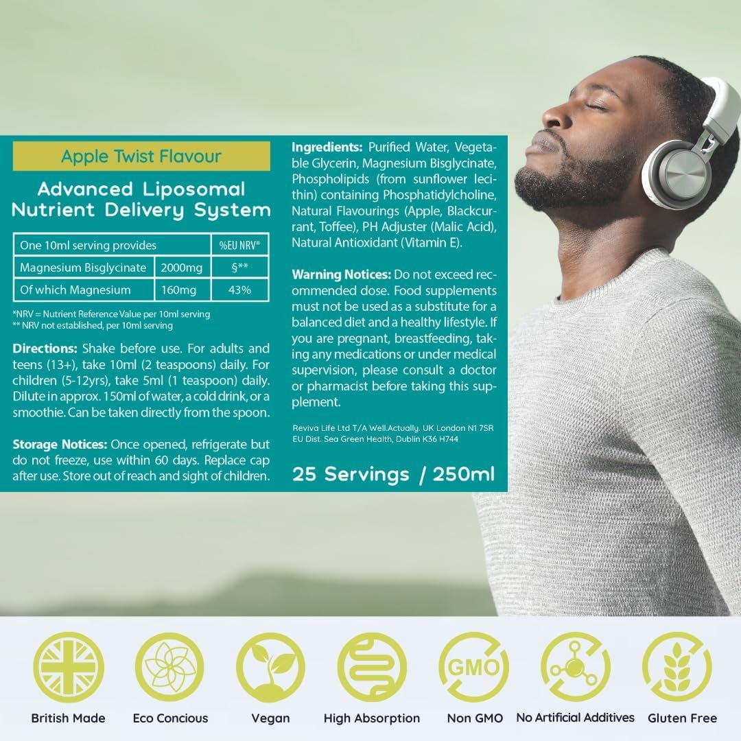 Liposomal Magnesium Glycinate High Strength 2000mg – High Bioavailability Liquid Magnesium Bisglycinate Supplement for Brain, Muscle, Sleep Support – Apple Twist (250 ml)