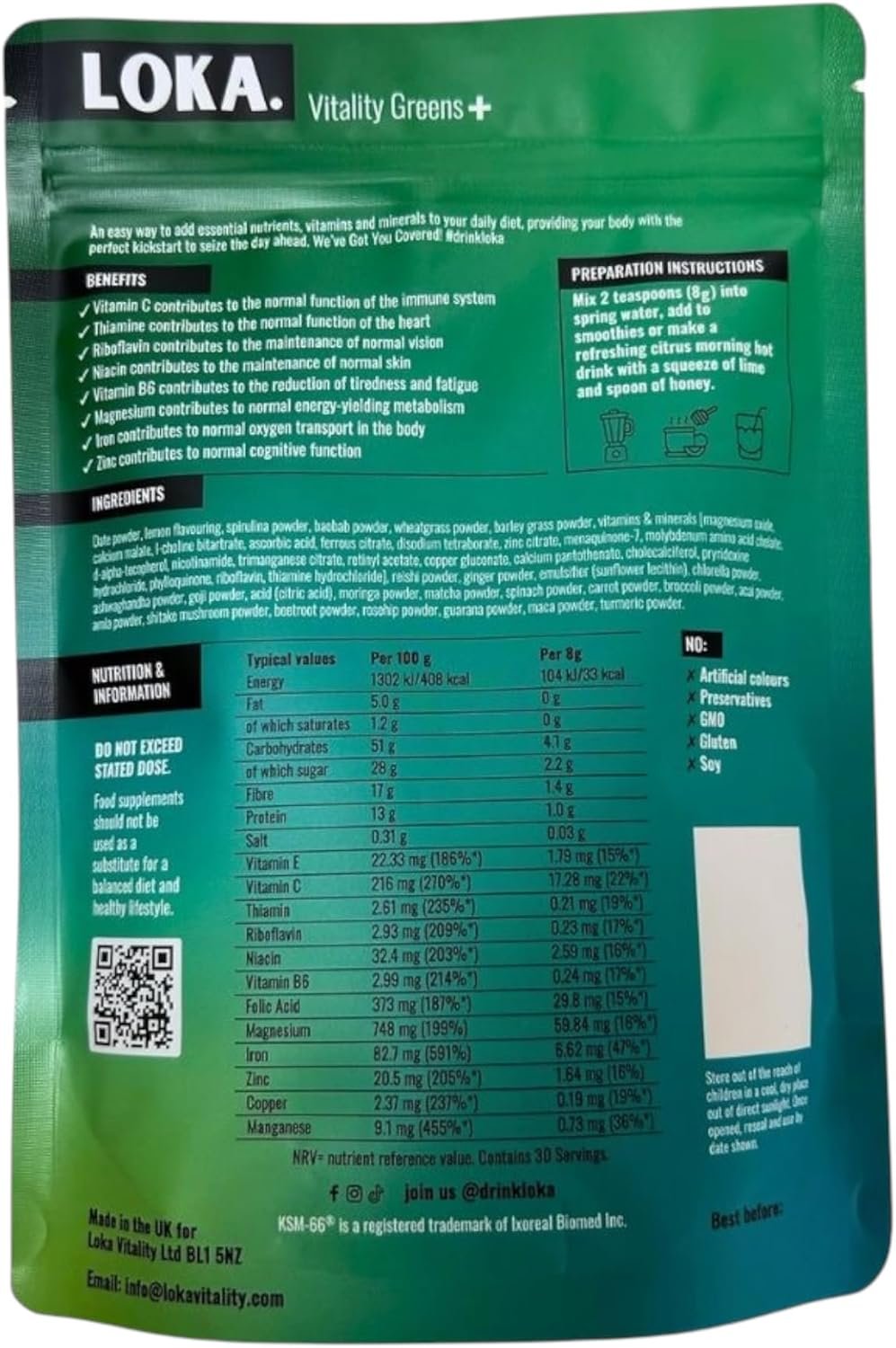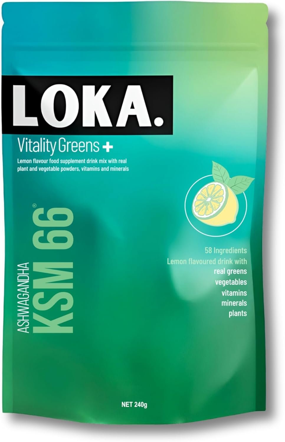 LOKA Vitality Greens+ -Daily Super Greens Powder for Energy – Gut Health & Immunity – 58 superfoods with Ashwagandha KSM66, Maca Root, Spirulina & Chlorophyll – 240g (30 Servings) – Made in The UK