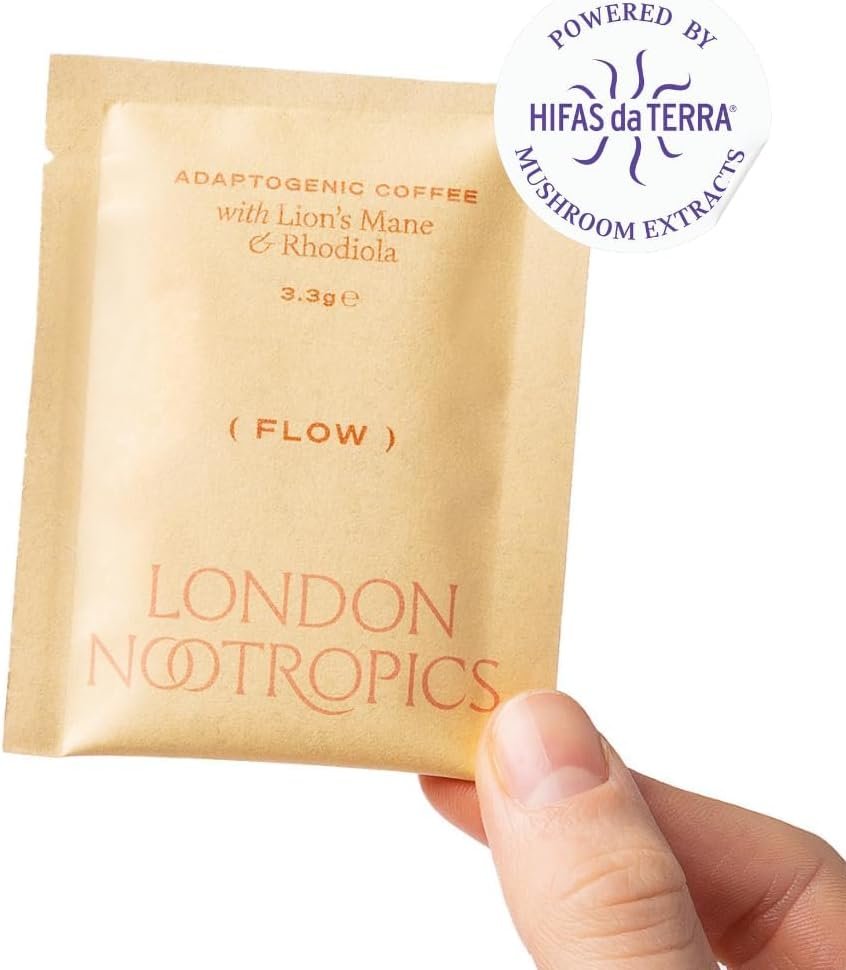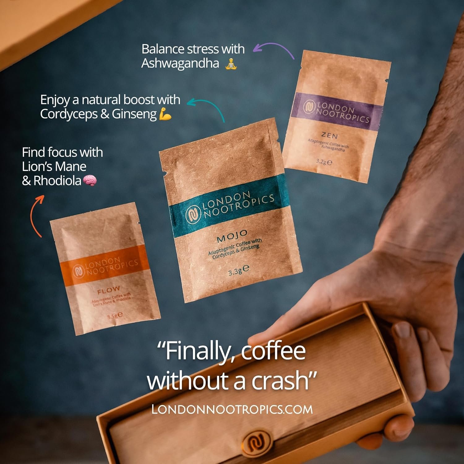 London Nootropics – Mushroom Coffee Box – Flow & Mojo Adaptogenic Mushroom Coffee – 12 Sachets