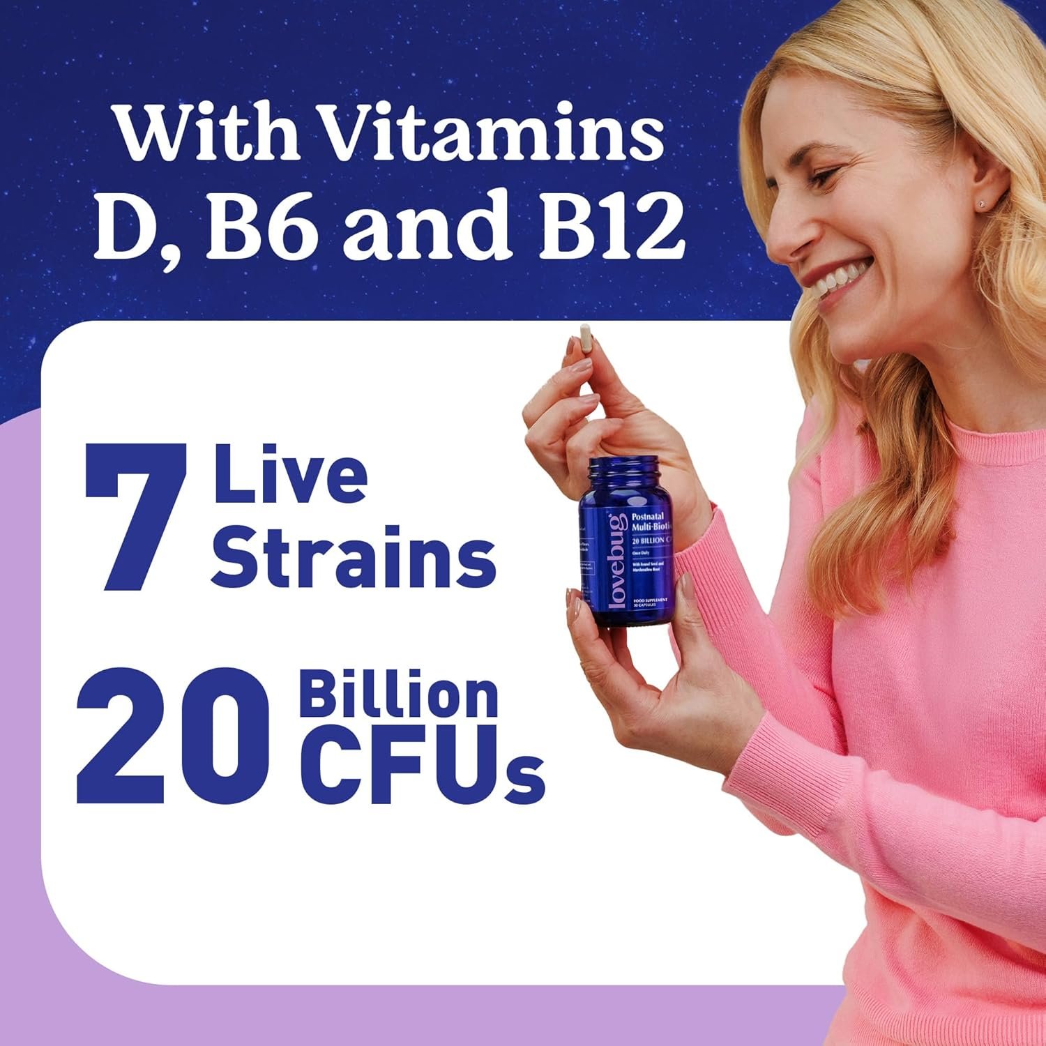 Easy to Take – Stay consistent with Lovebug Postnatal Multi-Biotics. Take one delayed-release multi-biotic capsule daily before food.