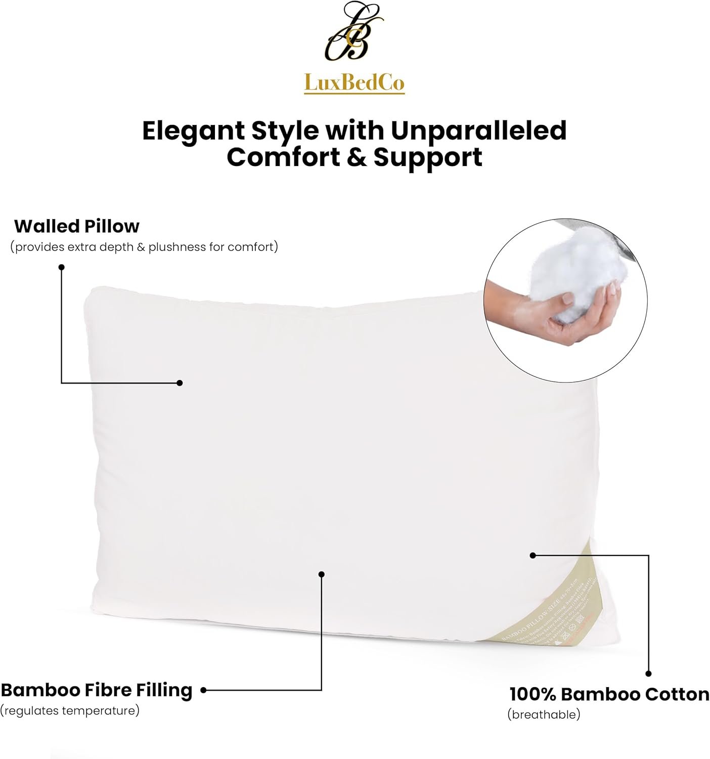 LuxBedCo Luxury Bamboo Pillow Pack of 2 – Luxury Soft Bed Pillow with 100% Bamboo Fibre Filling & Cotton Casing – Head & Neck Support – Cooling in the Summer, Warming in the Winter