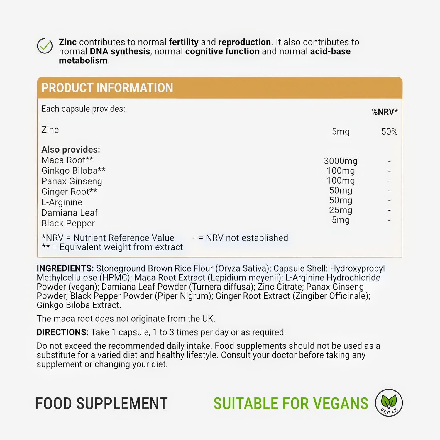 Maca Complex is designed to provide comprehensive support for men. Each easy-to-swallow capsule contains a potent blend of 8 herbal ingredients, with 3000mg of Maca Root at the forefront, featuring Ginkgo Biloba, Panax Ginseng, and Damiana Leaf. Maca root, a revered superfood from Peru, is rich in essential vitamins, minerals, and amino acids. Vitality and endurance.