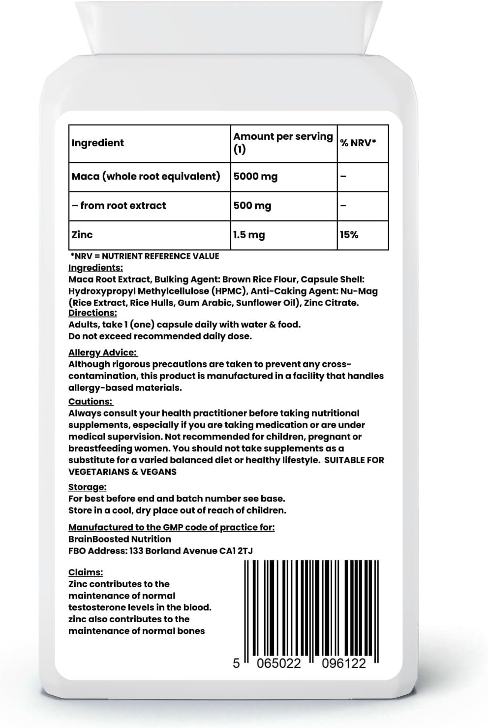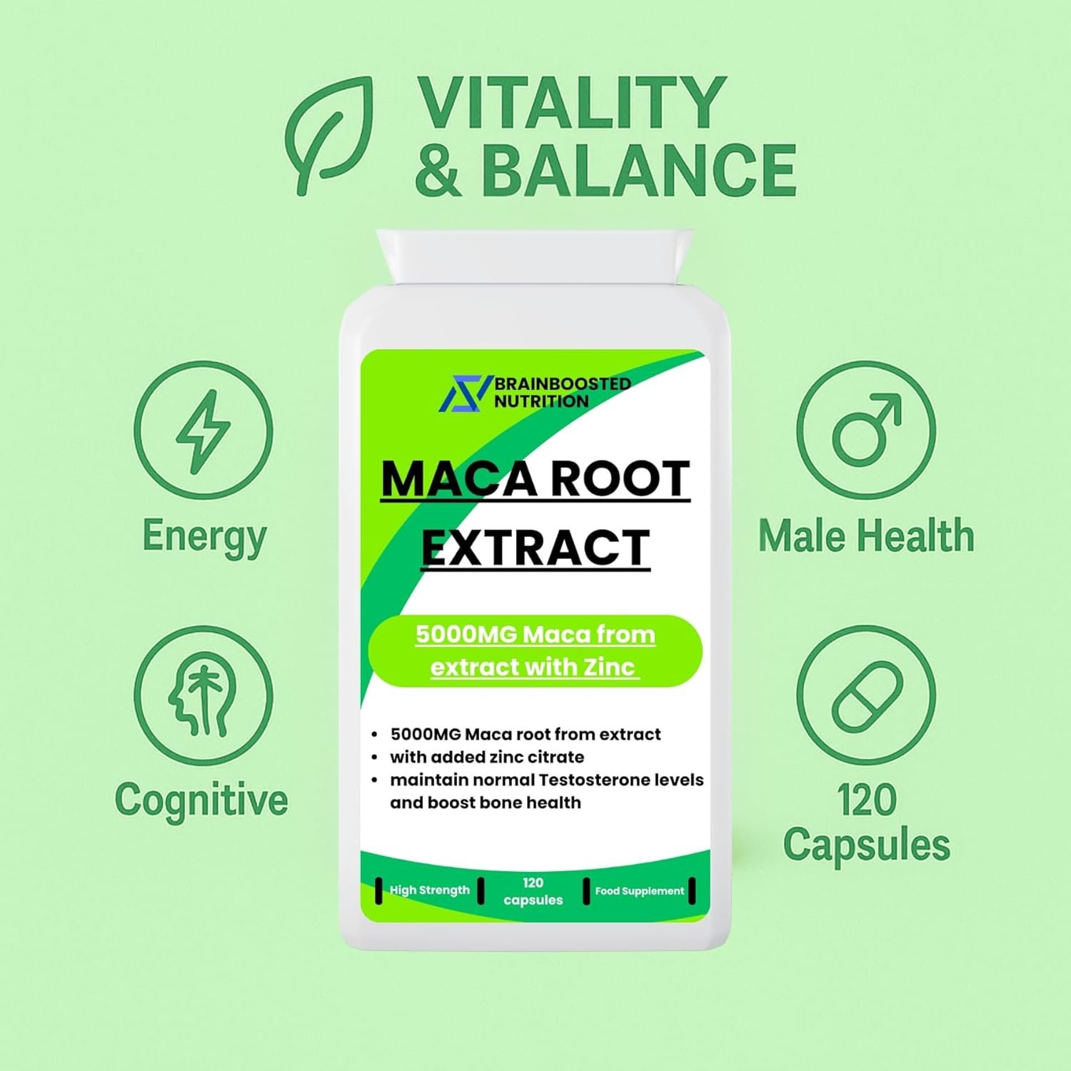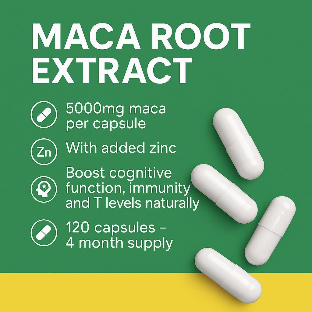 Maca Root Extract 5000mg with Zinc – High Strength Maca Capsules for Energy, Vitality & Performance – 120 Capsules (4 Month Supply)