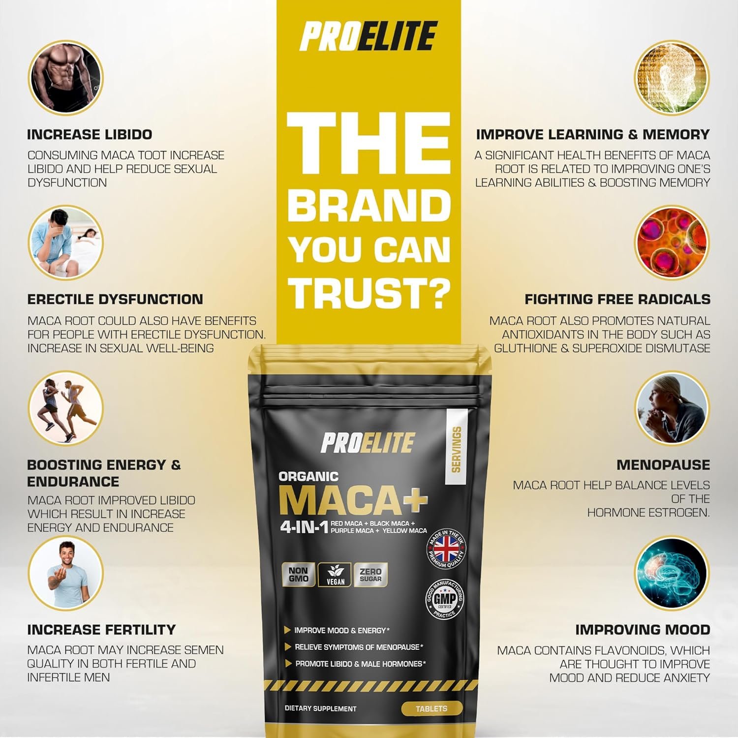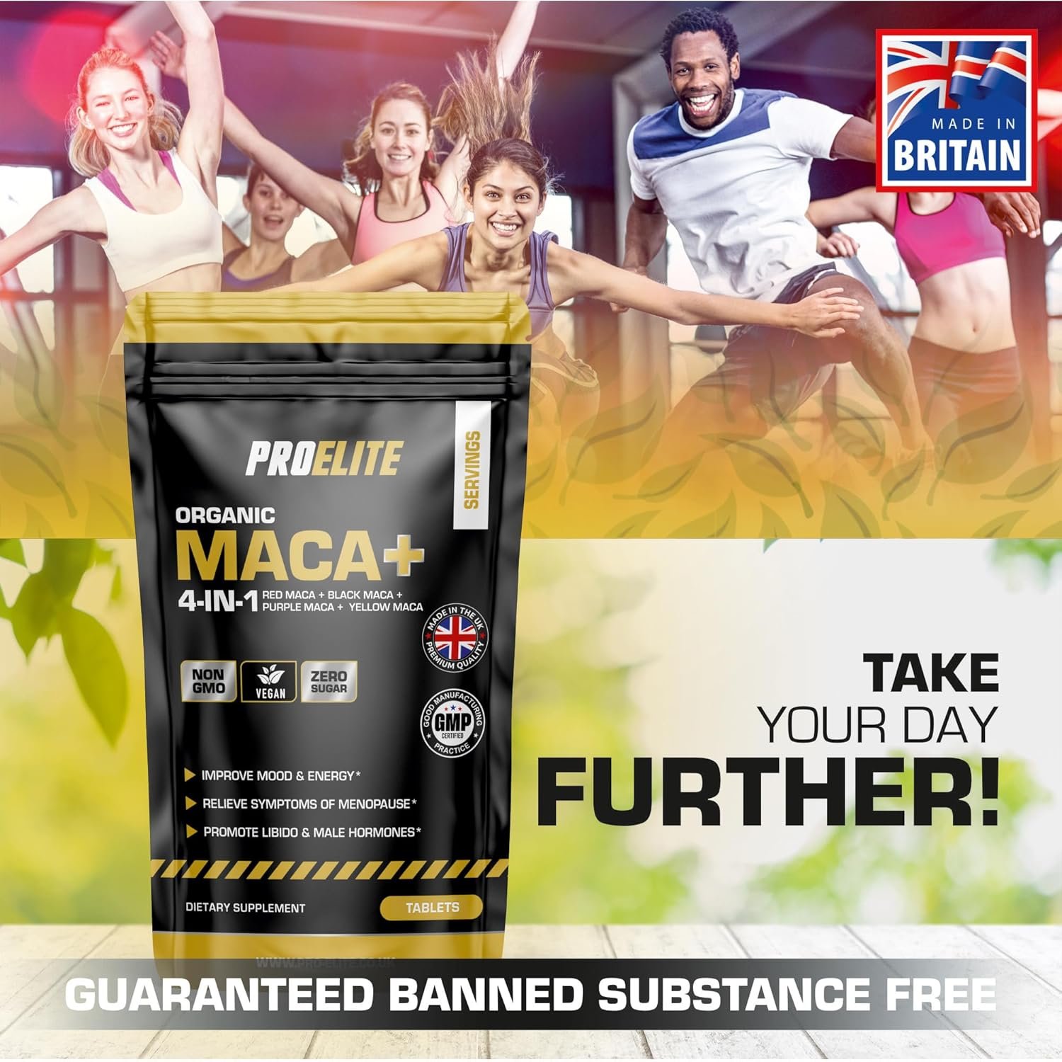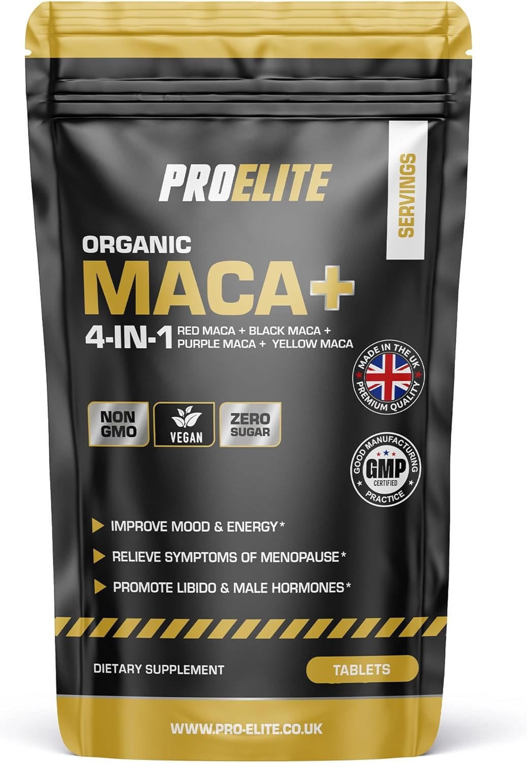 Discover the Power of PROELITE Maca Root Tablets Overview: The maca plant, scientifically known as Lepidium meyenii and often called Peruvian Ginseng, is renowned for its health benefits. PROELITE Maca Root is cultivated on the high plateaus of the Peruvian Andes, offering a natural remedy for various health issues, including infertility and low sex drive. Our tablets are composed of approximately 70% yellow maca root and a 30% blend of red, black, and purple maca roots, enhancing their nutritional value. Nutritional Benefits: Maca Root is rich in fiber, amino acids, vitamins, and minerals. It also contains bioactive compounds such as macamides, macaridine, alkaloids, and glucosinolates, which are believed to contribute to its medicinal properties. Key Features: Boosts Mood & Energy Alleviates Menopause Symptoms Enhances Libido & Male Hormones Usage Directions: For optimal results, take 1-2 tablets daily with a glass of water, preferably with a meal, or as directed by a healthcare professional. Please note that Maca Root Extract Tablets are dietary supplements and should be part of a varied and balanced diet. Do not exceed the recommended dose unless advised by a physician. Keep out of reach of children. Nutritional Information: Per 1 Tablet: 100mg Maca Root Extract Per 2 Tablets: 200mg Maca Root Extract 100mg Maca 5:1 Extract = 500mg Raw Maca Root Herb Ingredients: Maca Root (5:1 Extract Matrix: Yellow, Red, Black, and Purple Maca Root Extracts), Magnesium Stearate, Silicon Dioxide, Bulking Agent: Microcrystalline Cellulose