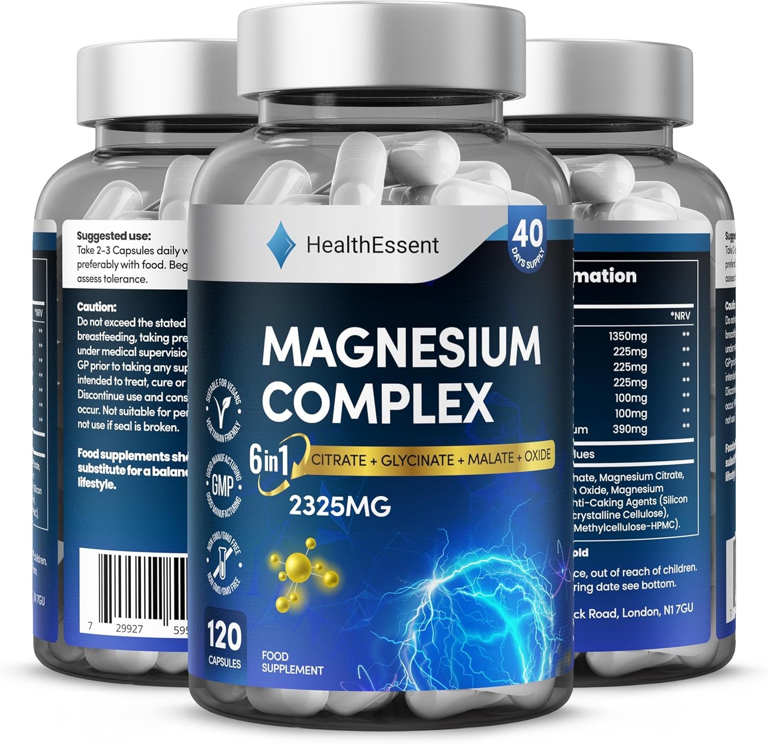 Magnesium 6-in-1 Complex, 2325mg with Magnesium Citrate, Glycinate, Malate, Oxide, Taurate and Orotate – Promotes Sleep, Energy and Muscles – For Stress & Anxiety Relief – 120 Capsules by HealthEssent