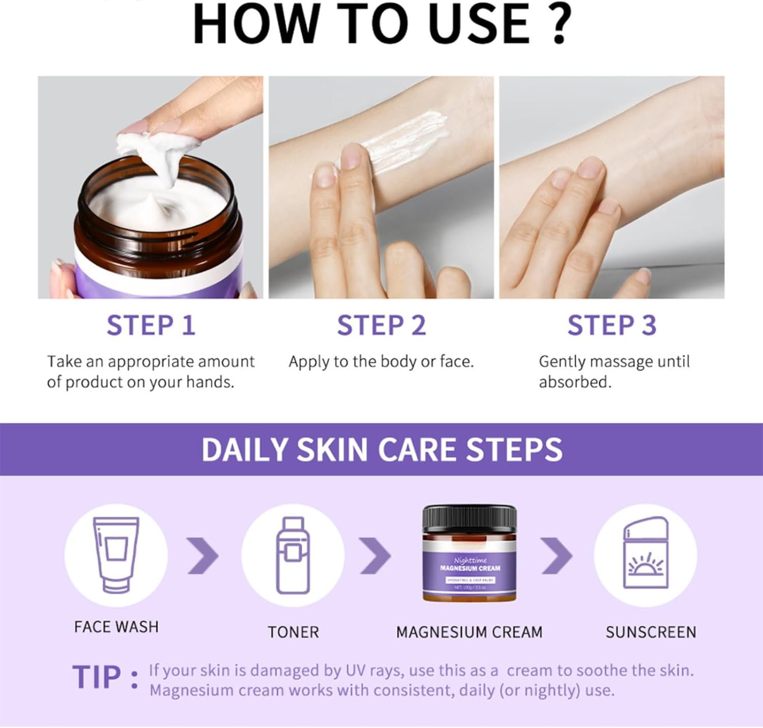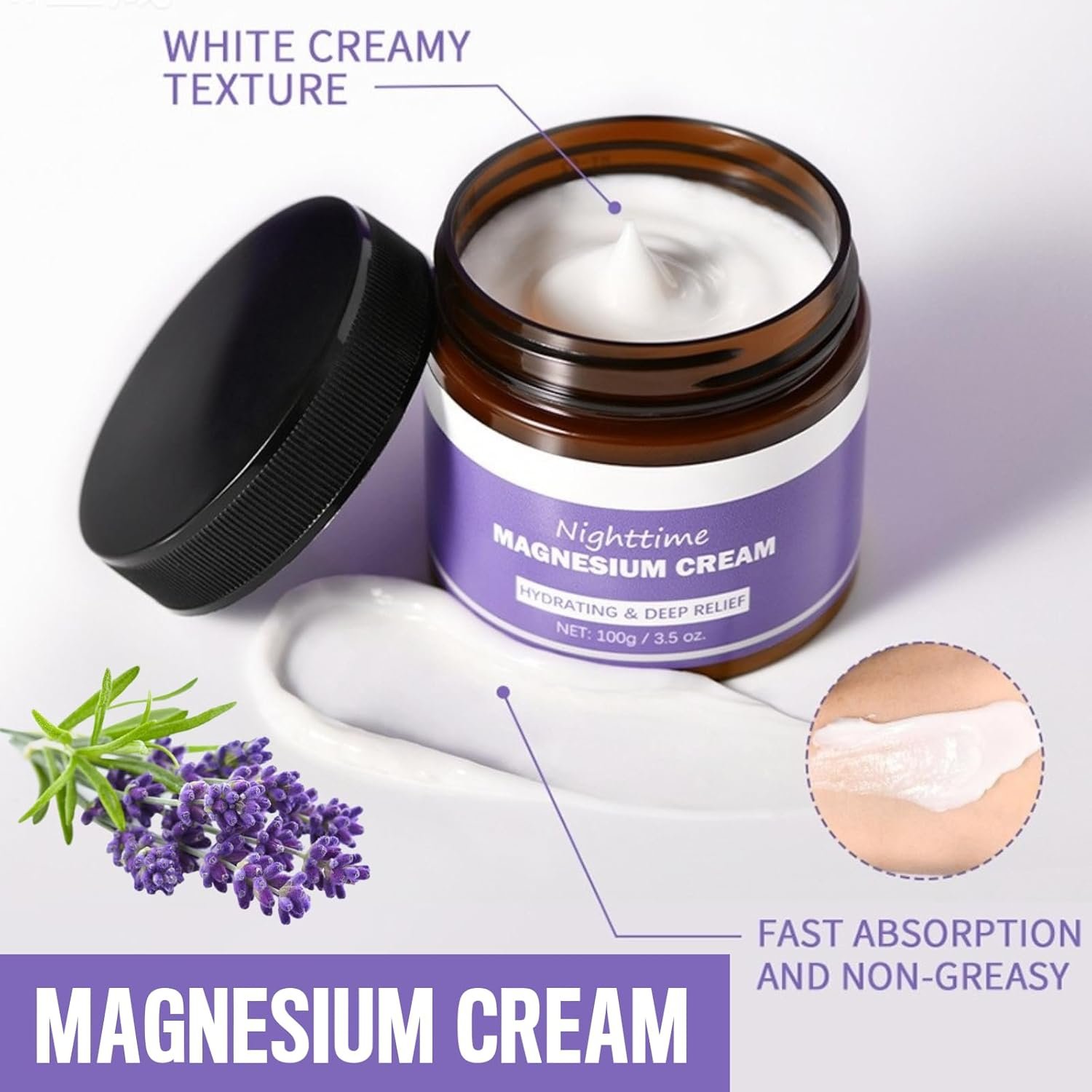 🌿 DEEP NIGHT NOURISHMENT — Experience long-lasting hydration with a creamy magnesium cream base formulated to act as an overnight magnesium moisturiser. The lightweight balm fills dry patches and helps lock in moisture, leaving skin softer by morning; gentle enough for nightly use as a magnesium cream for sleep in your bedtime ritual