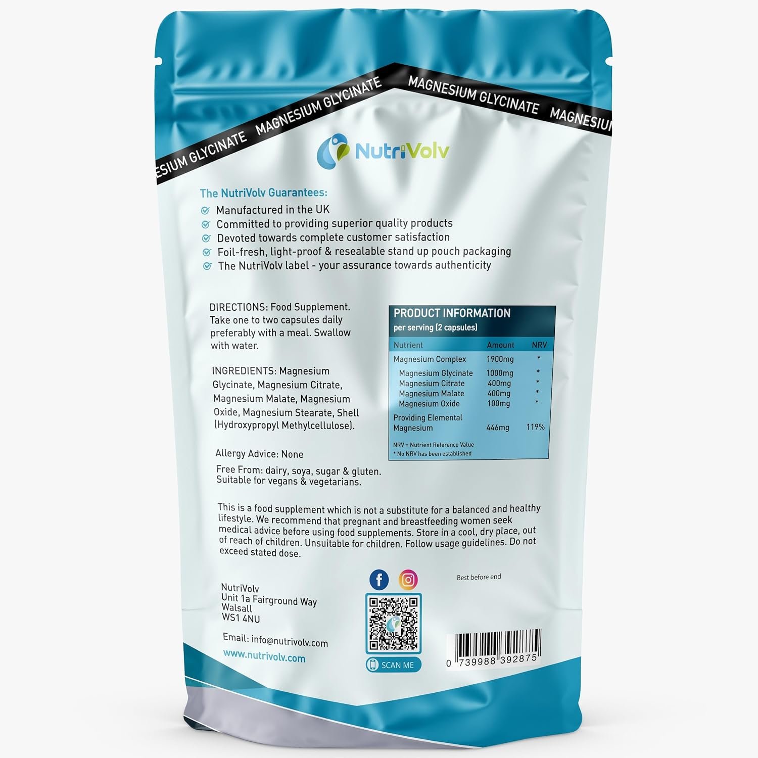 100% VEGAN – We like to be inclusive here at NutriVolv which is why our Magnesium Complex is Vegan Friendly, Gluten-free, Dairy-free, Cruelty-free, Soy-free and sugar free. We fully understand the importance of providing supplements that caters to everyone’s needs where possible, are sourced & produced ethically and most importantly at an affordable price.