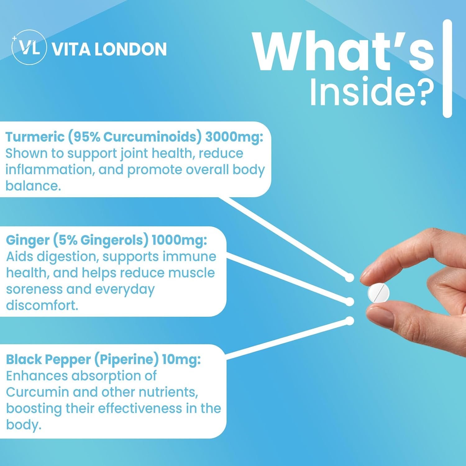 TURMERIC, GINGER & BLACK PEPPER: Curcumin is the main beneficial active compound in turmeric. Vita London has a 95% high strength extract. 3000mg (50:1 Extract) Of Turmeric Per Serving (2 tablets daily) and 10mg (60:1 Extract) Of Black Pepper and 1000mg of Ginger (23:1 extract). Each pack contains 120 tablets (60 daily servings).