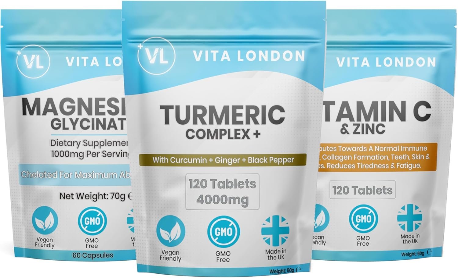 Magnesium Glycinate, Vitamin C, Zinc & Turmeric | Vita London Spring Supplement Bundle | High Strength Tablets/Capsules for Men & Women | Made in UK, Vegan