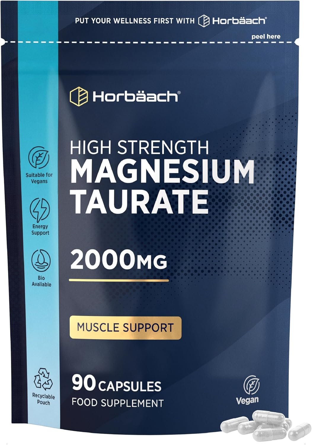 Magnesium Taurate Supplement 2000mg | High Strength Balanced Formula for Absorption & Bioavailability | 90 Vegan Capsules | for Men & Women | Horbaach