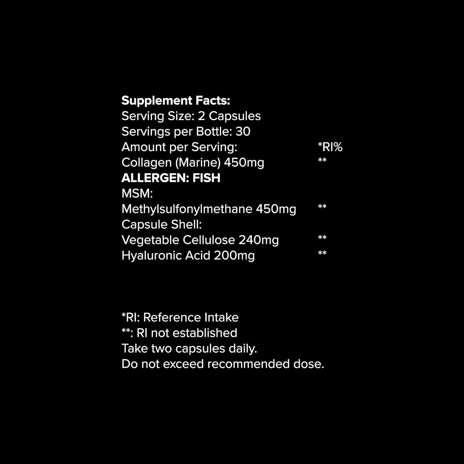 MARINE COLLAGEN FOR SKIN STRUCTURE & ELASTICITY | Sourced from fish, marine collagen delivers key amino acids that support skin elasticity and firmness. Shown in studies to help maintain youthful appearance and smoothness.