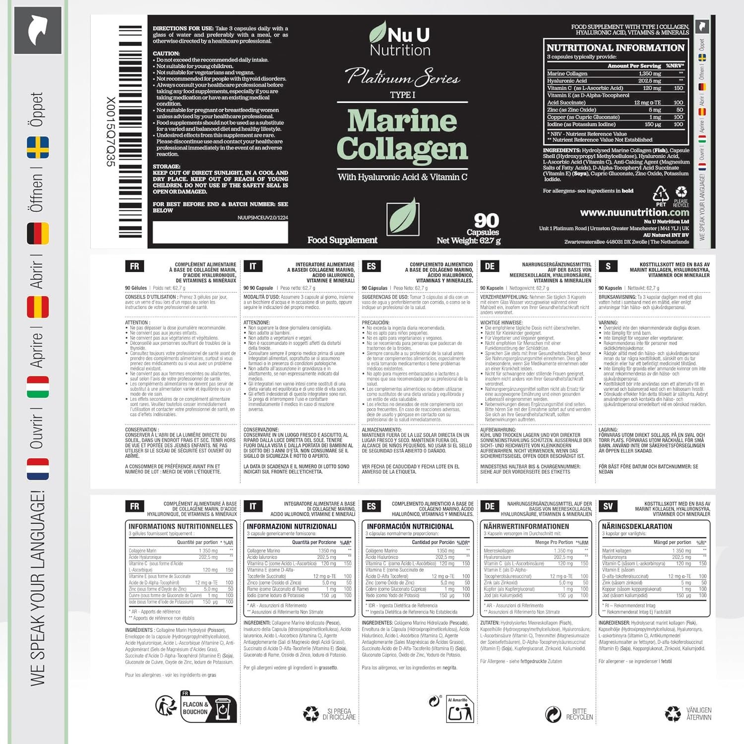 SUSTAINABLY SOURCED – Nu U sources its marine collagen peptides from Basa and Tilapia found in South America and South East Asia. We use only the fish skin (typically thrown away) which is naturally rich in Collagen. Our facilities ensure safe removal of any harmful contaminants such as heavy metals leaving a pure marine collagen. Our hydrolysed collagen is free of gluten, dairy, pesticides and GMO ingredients, as well as artificial colours, flavours, excipients, binders or fillers.