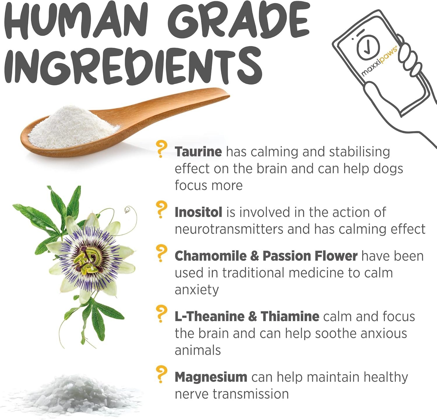 NATURAL CALMING INGREDIENTS: Taurine, L-Theanine & Thiamine can help calm anxious pets & focus the brain; Inositol may aid neurotransmitters in the brain; Chamomile & Passion Flower are often used to calm anxiety & promote good sleep; Magnesium can aid muscle tension.