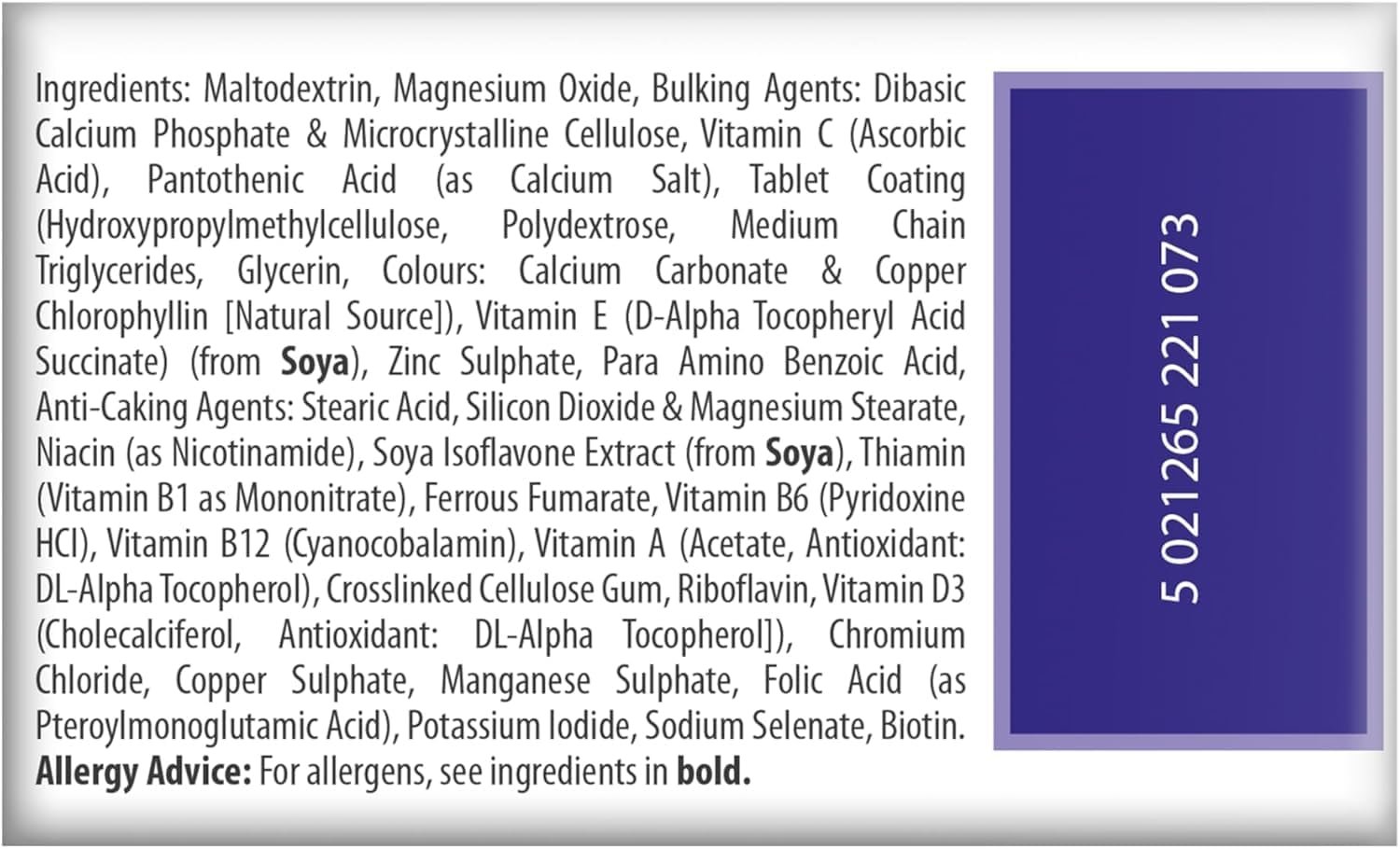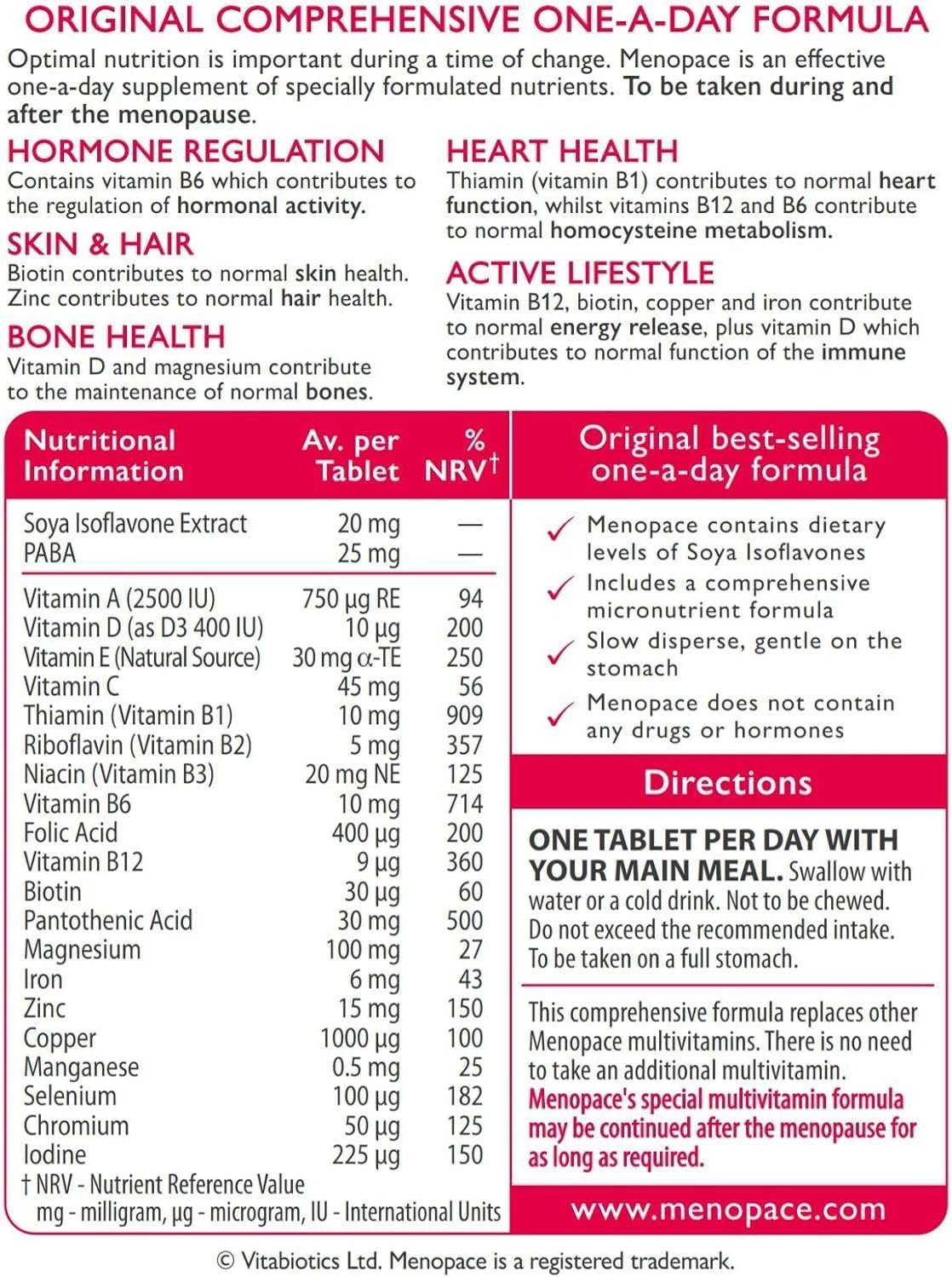 Calcium Carbonate (1200mg per dose) Vitamin D3 (10μg) Soy Isoflavones (phytoestrogens for menopause symptoms) Magnesium (magnesium oxide) Vitamin B6 (pyridoxine) Zinc (zinc sulfate)