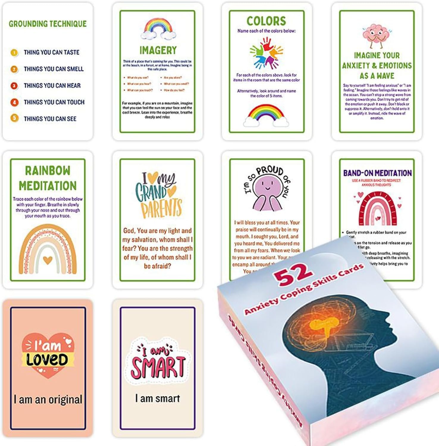 Support: Designed to assist through breathing exercise guides and stress coping skills instructions, these cards ensure access to convenient relief strategies, allowing users to find comfort in emotionally difficult times at work, school, or during moments of personal calm.