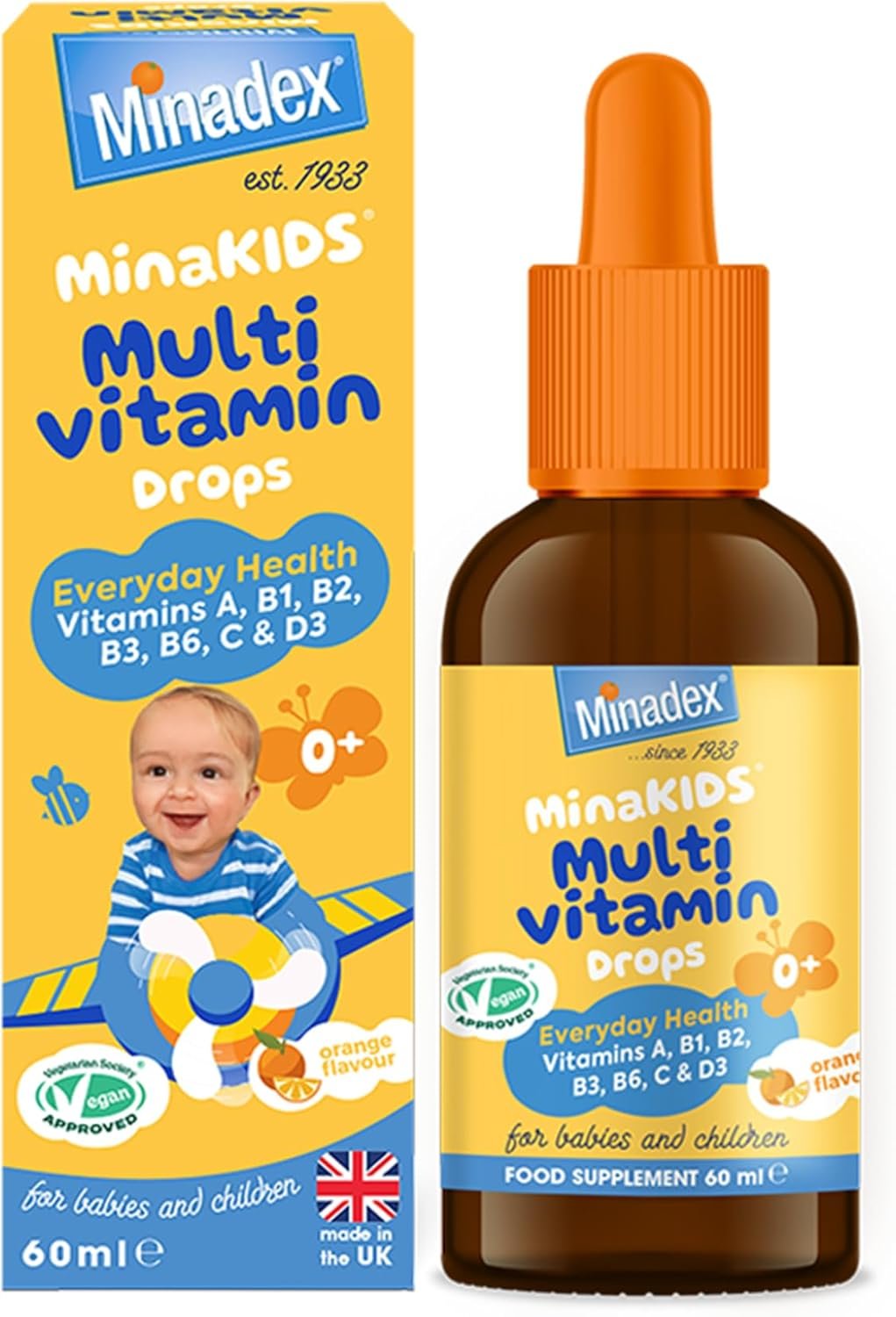 MinaKIDS Multivitamin Drops – 7 Essential Vitamins A, B1, B2, B3, B6, C & D3 (400IU), Yummy Orange Flavoured Formula Loved by Babies and Children, Vegan, 60ml