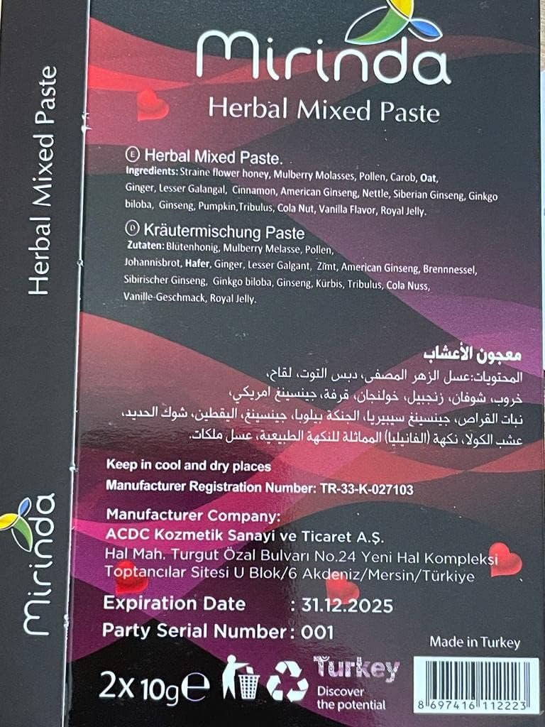 Mirinda Bitkisel MACUN Herbal Paste/with Red Ginseng, Tribulus- Natural Herbal Energy Safe, Fast Acting, Lasting Performance Support for Man and Woman Fast Action 2 Sachets*10 Grams (2)