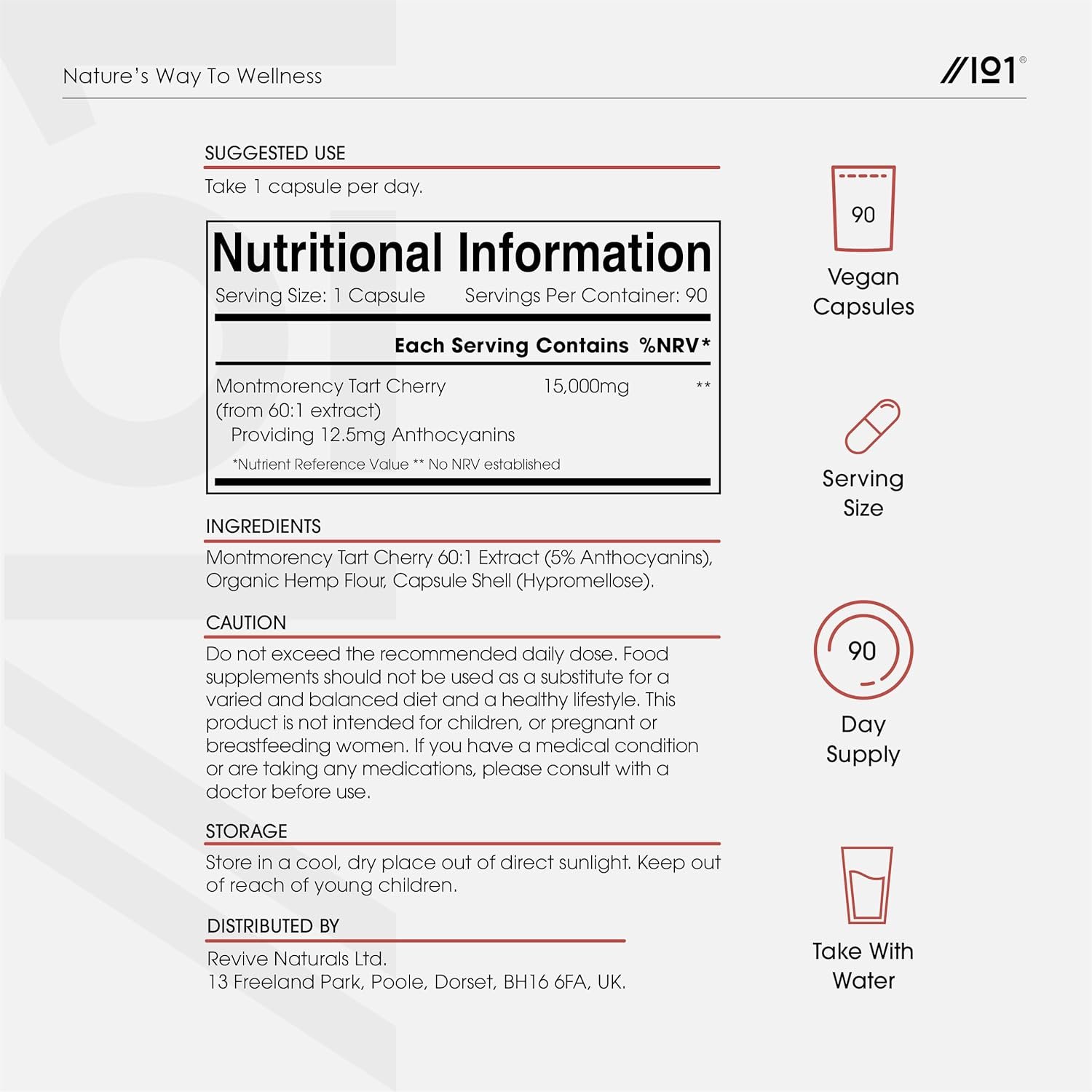 ✔ HIGH STRENGTH MONTMORENCY TART CHERRY EXTRACT: Each capsule contains the botanical equivalent of 15,000mg (15 grams) of Montmorency Tart Cherry, with a potent 60:1 extract providing 12.5mg of naturally-occurring anthocyanins.