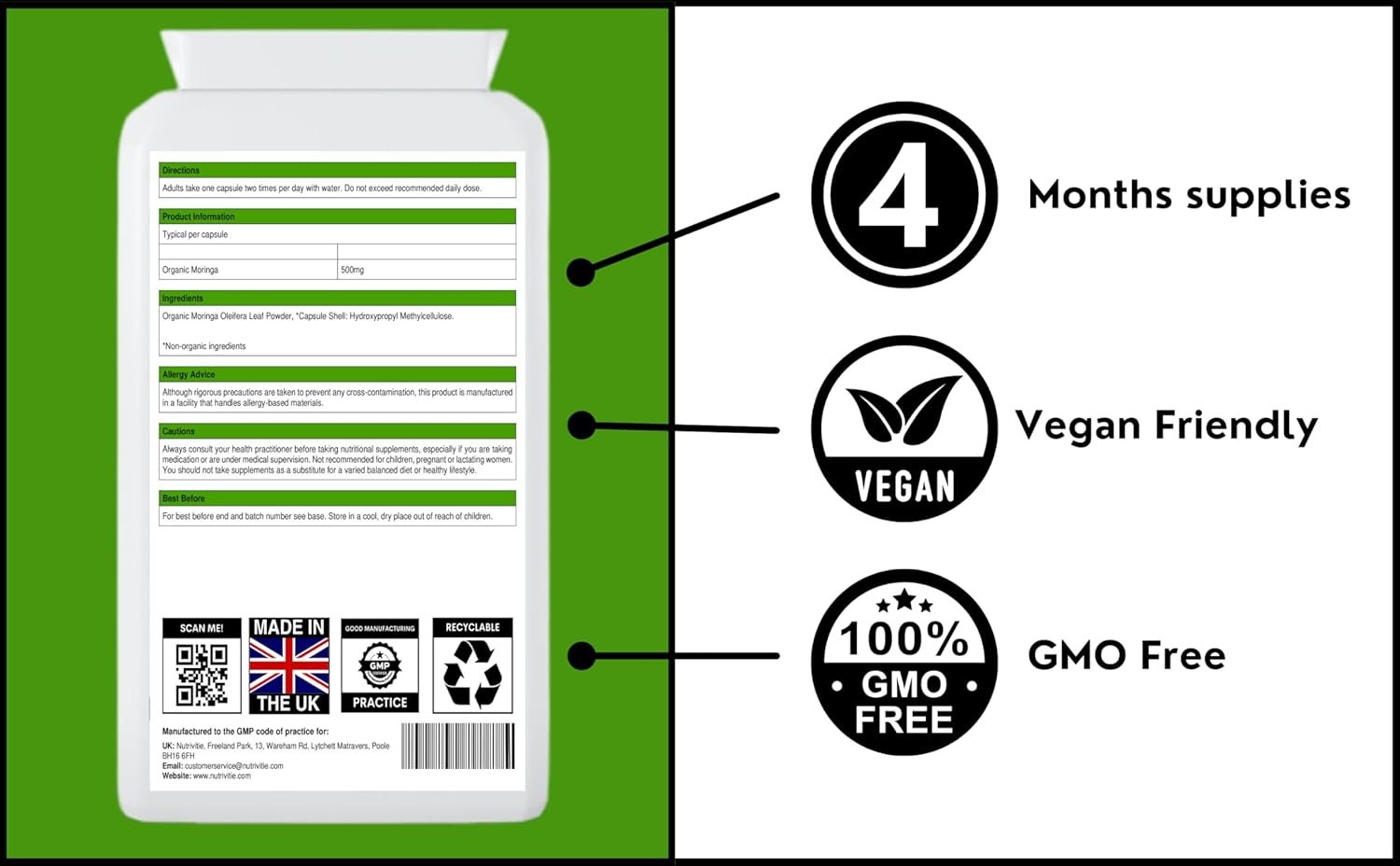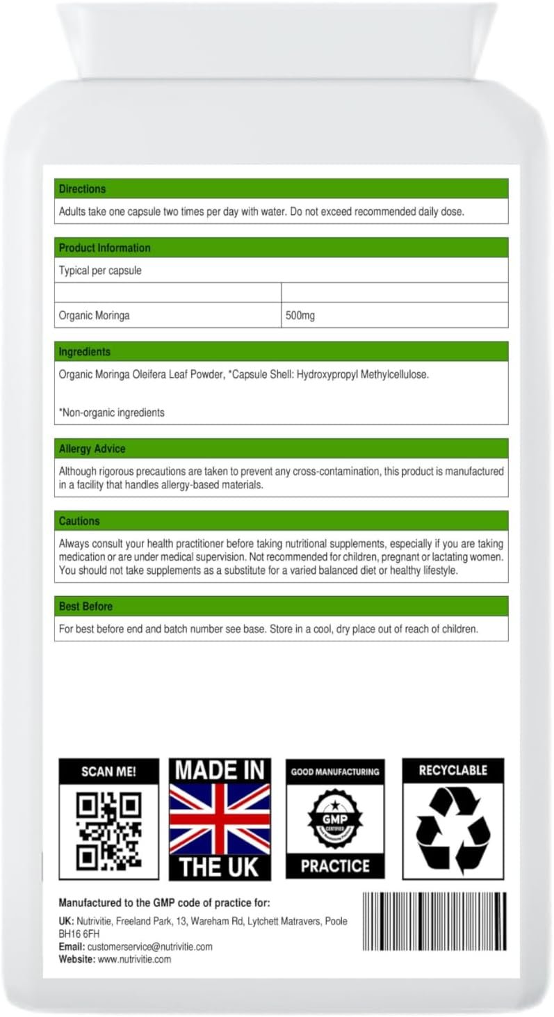✔ PURE, CLEAN & VEGAN – Made from premium-grade organic moringa powder with no unnecessary additives. Free from ✘ lactose, ✘ gluten, ✘ soya, ✘ starch, ✘ yeast, ✘ dairy, ✘ wheat, and ✘ GMOs. Our vegan moringa capsules are manufactured in the UK to high quality standards, giving you a consistent, reliable, and plant-based supplement for everyday health.