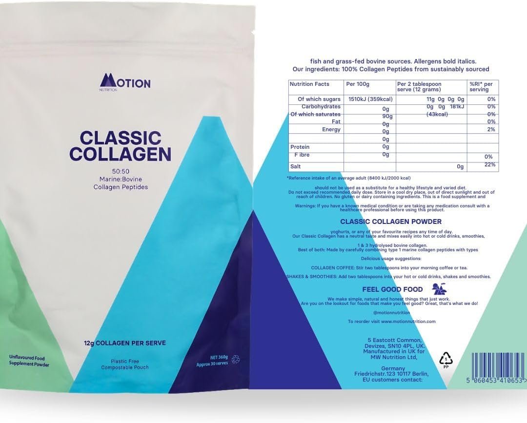 Benefits for Your Skin, Hair, Joints & Bones: Supplementing with 10-12g of collagen daily can replenish your collagen stores, promoting skin elasticity and a youthful appearance. Marine Collagen, present in our Classic Collagen, offers type 1 peptides that nourish healthy hair, skin, nails, and even eyes. Meanwhile, the Grass-fed bovine collagen peptides contribute to the health of your joints and ligaments.