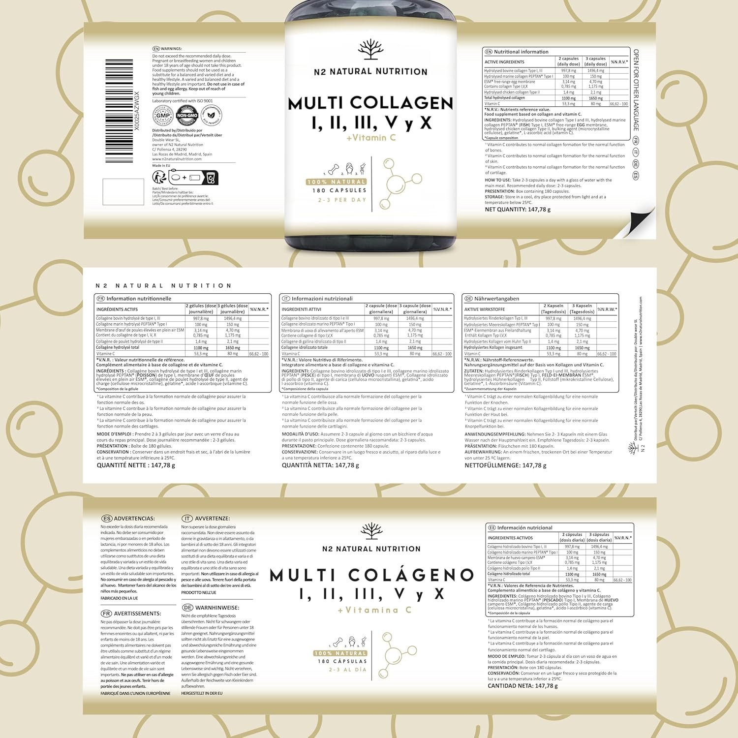 Multi Collagen 1650mg Type I, II, III, V, X. Bovine, Marine Collagen Peptides 180 Capsules Enhanced with Vitamin C, for Joint Care, Skincare & Hair High Strength Collagen N2 Natural Nutrition