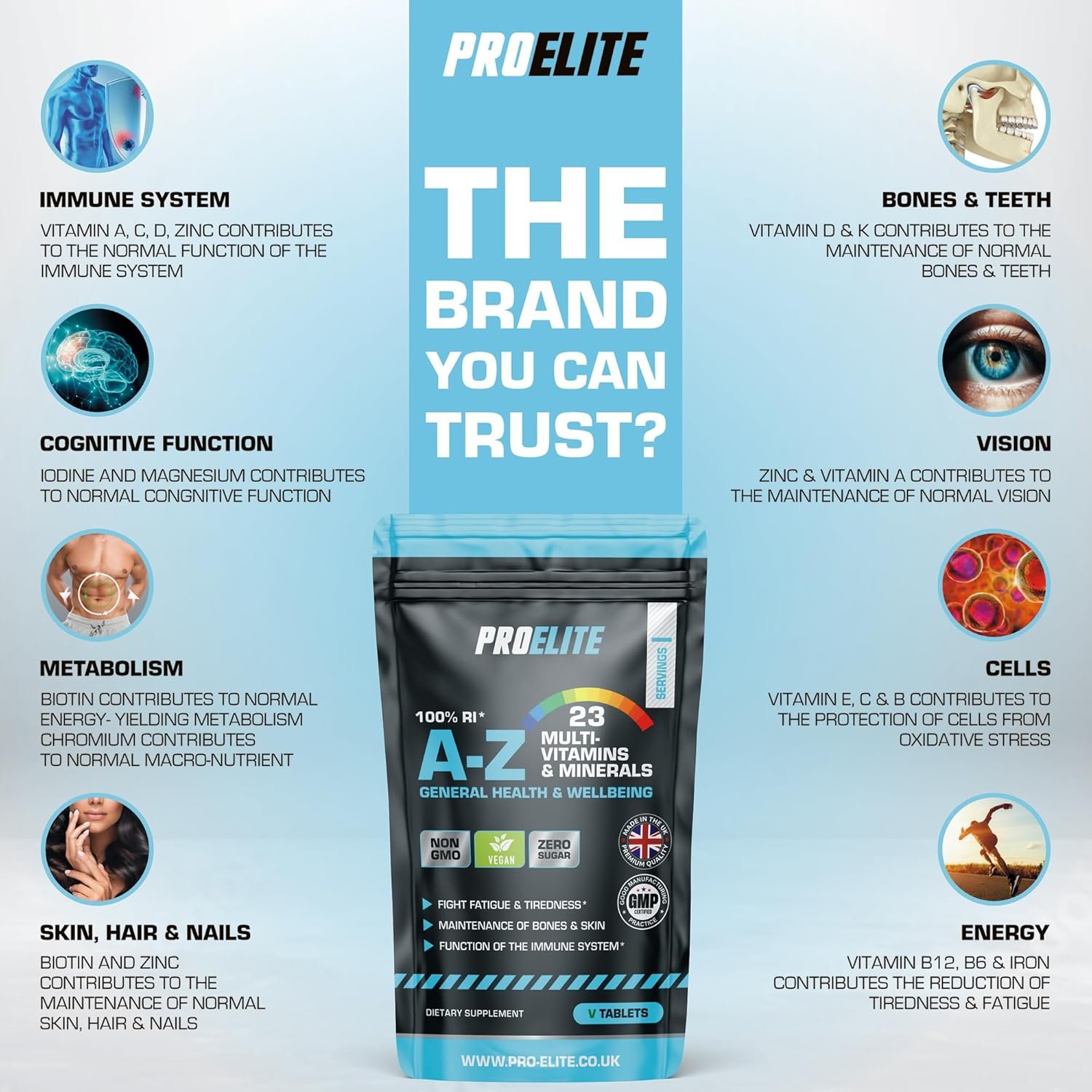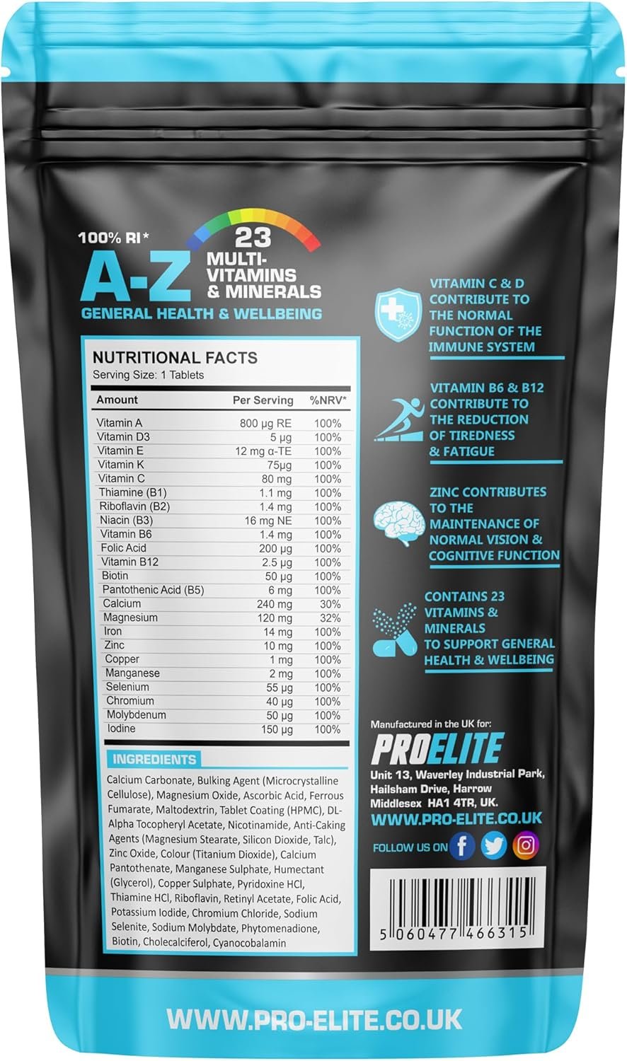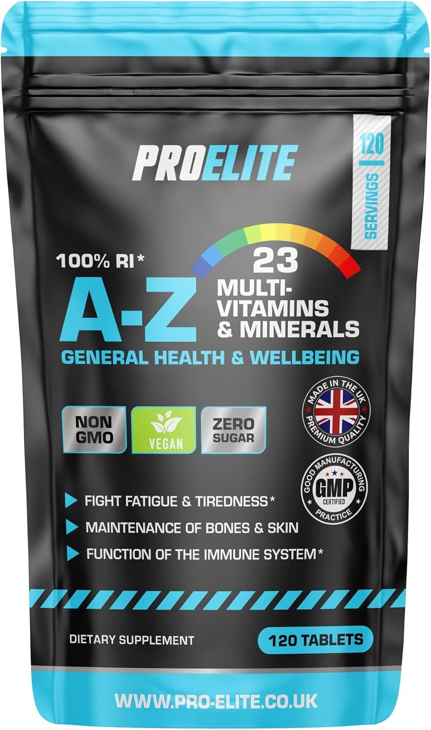 Multivitamins & Minerals – 120 Vegan Tablets – One a Day 100% RDA – 23 Essential Vitamins & Minerals in A-Z Multivitamin Tablet – Made in The UK by PROELITE