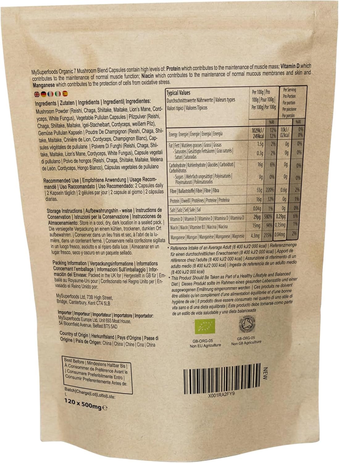Discover the Potent Benefits of Seven Mushrooms into One! Mushrooms are considered some of the world’s most potent superfoods. Our blend consists of 100% Reishi, Chaga, Shiitake, Maitake, Lion’s Mane, Cordyceps, and White Fungus.Because of a high content of powerful plant nutrients found in mushrooms, we’ve combined seven of the most potent mushrooms to form one potent combination of superfood.A Healthy Boost for Your Body and MindEach mushroom used in this blend consists of its own unique health-giving polysaccharides and medicinal properties. When combined and consumed together, they increasingly support your health and enhance your well-being. You’ll also find a potent source of::Protein – Promotes muscle growth and helps maintain healthy bonesManganese – Boosts energy, contributes to normal formation of connective tissueVitamin D – Contributes to the maintenance of normal muscle function and maintenance of normal bones and teethNiacin – Contributes to the maintenance of normal mucous membranes and skin MySuperfoods Organic Mushroom Blend capsules is so simple to add to your favourite food and drinks to form part of your healthy lifestyle and supercharge your diet, so try it yourself today!