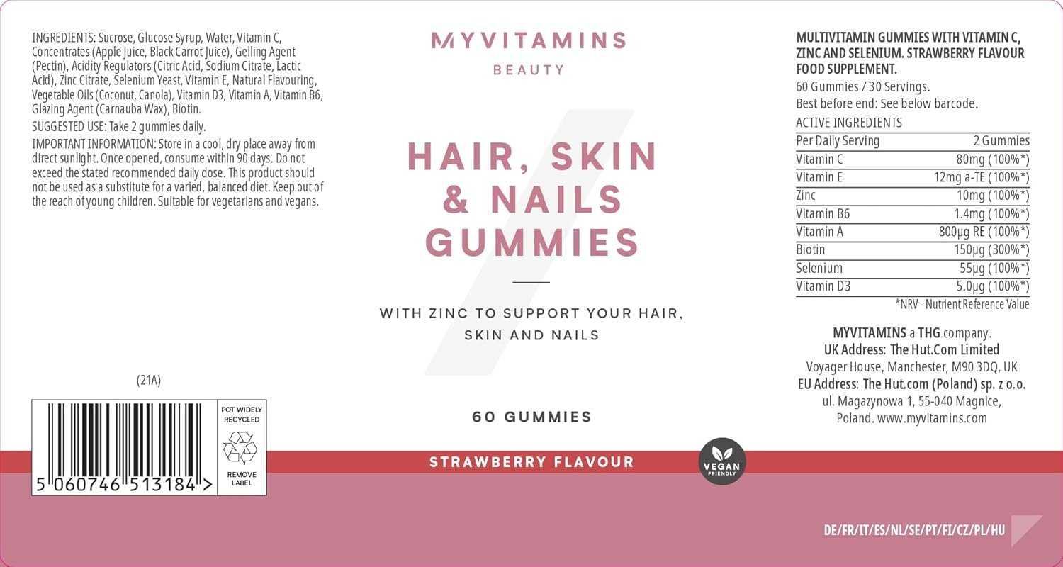 Myprotein Hair, Skin and Nails Gummies in Strawberry flavour are your all-in-one daily beauty supplement—designed to support hair strength, glowing skin, and nail resilience. These biotin-powered gummies combine zinc, vitamin C, and other essential nutrients to help you maintain a strong beauty foundation, every day. With additional support from folic acid and vitamin B6, these gummies also contribute to reducing fatigue and supporting mental clarity, helping you feel your best inside and out. Vitamin C aids in collagen formation for smoother skin, while zinc works behind the scenes to promote healthier nails and scalp function. Formulated for both women and men, these vegan-friendly strawberry chewables are a simple, enjoyable way to maintain your beauty and wellbeing—without reaching for pills or powders.