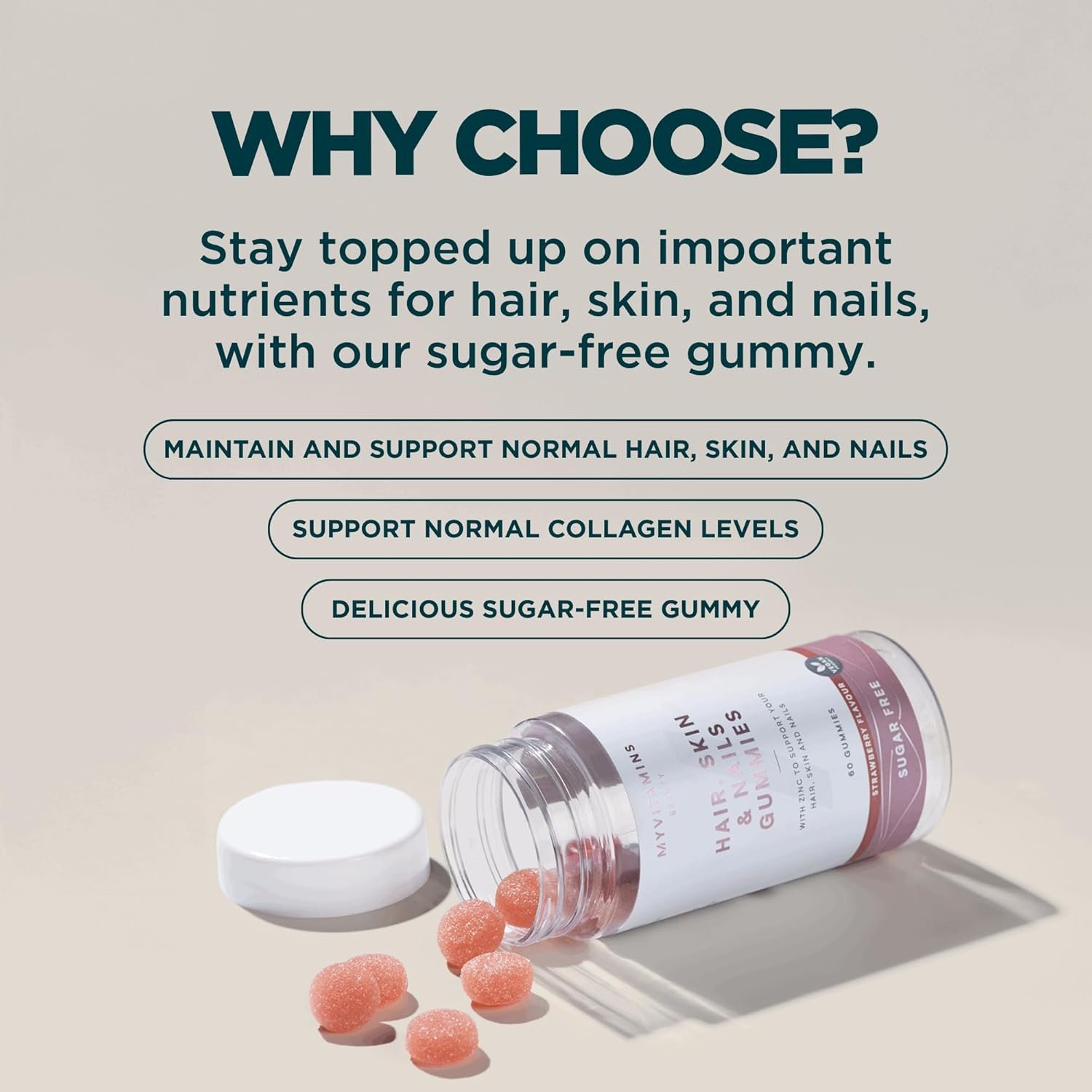 Skin, Nail & Hair Growth Support in Every Gummy: Each vegan gummy contains nutrients that contribute to normal collagen formation and healthy skin function, while promoting stronger hair and nails.