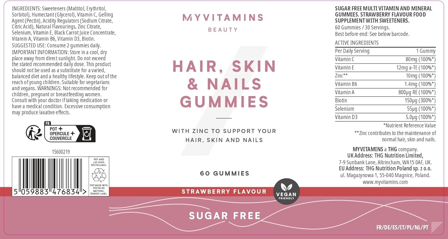 Myvitamins Hair, Skin and Nails Gummies – Biotin Hair Growth, Zinc & Vitamin C – Hair Vitamins for Women & Men – Hair Growth & Skin Support – Sugar Free Strawberry – 60 Vegan Chewable Supplements