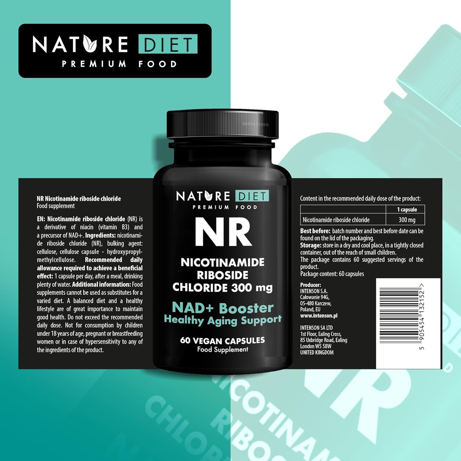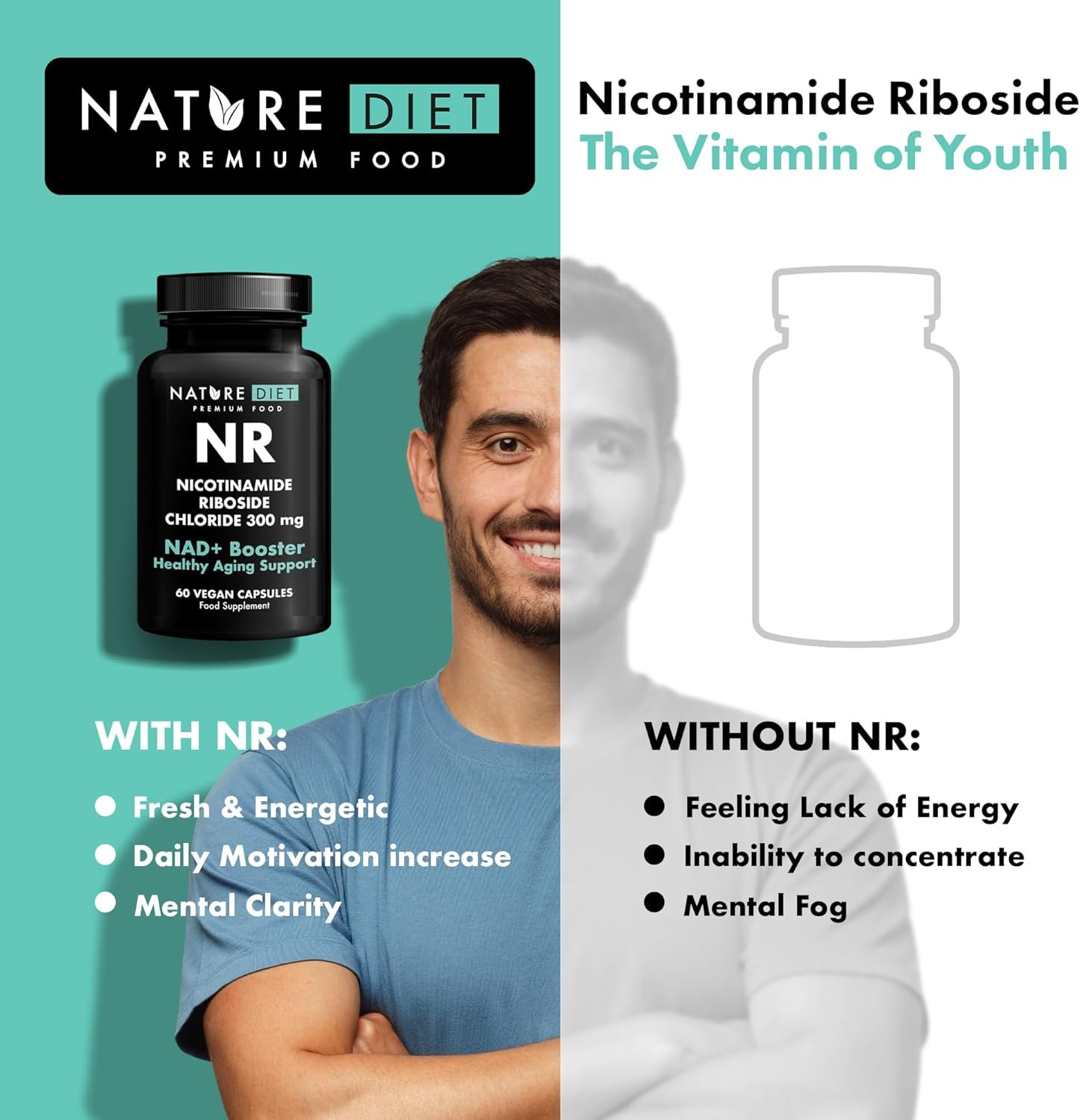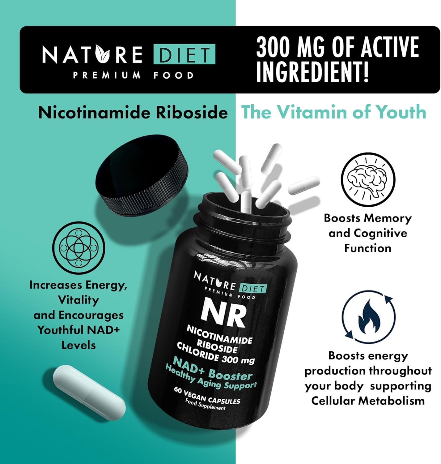 NAD+ Booster – NR – 300mg Nicotinamide Riboside – 60 Vegan Capsules – Supports Healthy Aging – by Nature Diet