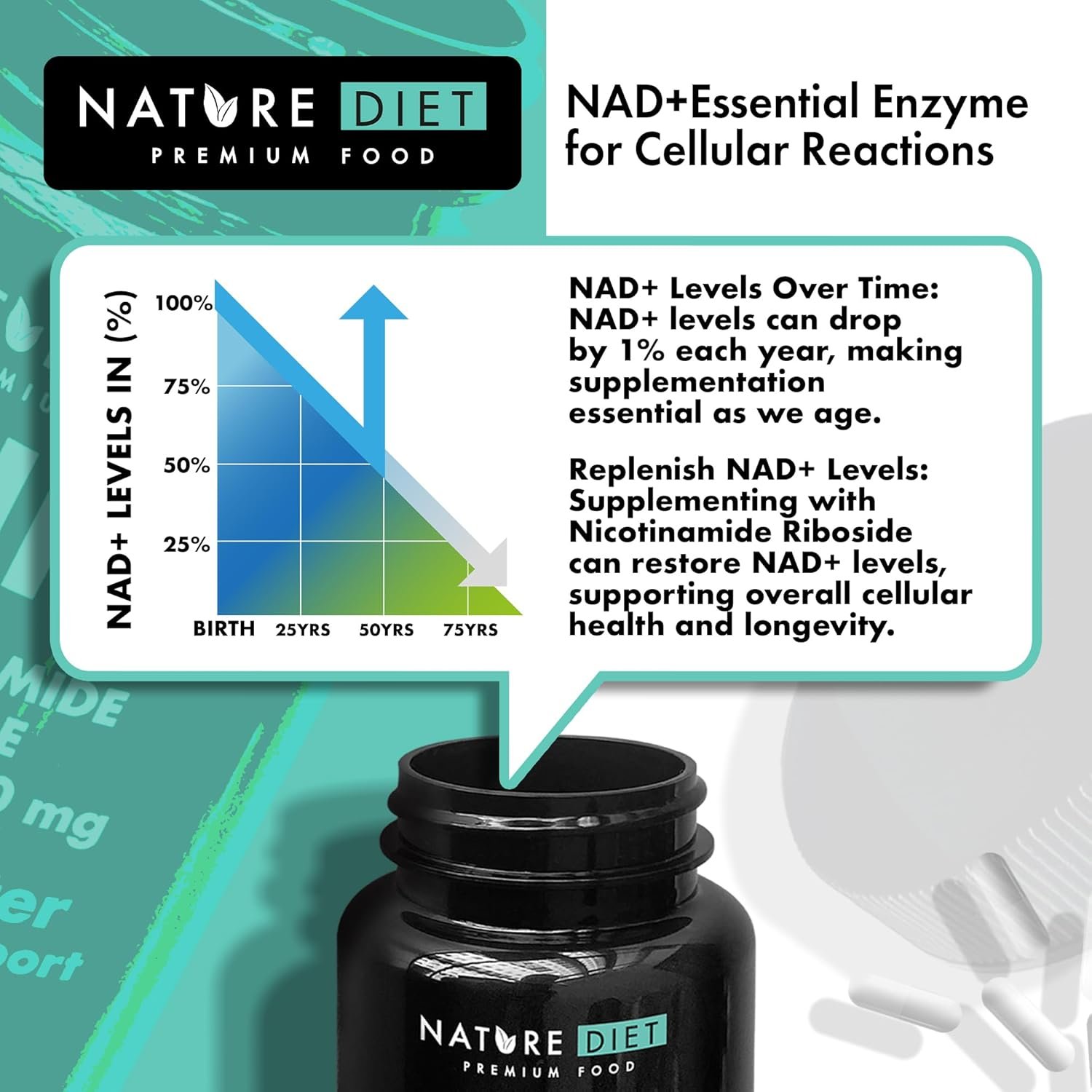 Why Choose Nature Diet Nicotinamide Riboside? Nicotinamide Riboside (NR) is a unique form of Vitamin B3 that supports NAD+ levels in the body, a critical coenzyme involved in energy metabolism and cellular repair. As we age, NAD+ levels naturally decline, which can affect energy levels, cognitive function, and overall cellular health. Nature Diet NR 300mg is a premium supplement designed to support NAD+ levels, contributing to natural aging processes, mental clarity, energy production, and skin health. Each serving delivers 300mg of active Nicotinamide Riboside Chloride, offering an effective way to maintain youthful vitality and well-being. Ideal for those looking to support their body’s natural aging process in a balanced and sustainable way.