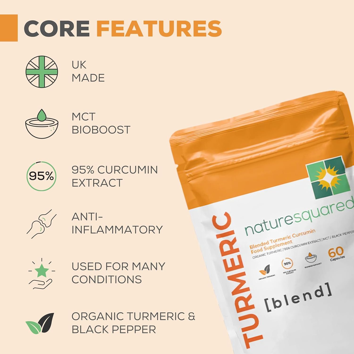 NATURE SQUARED Turmeric [Blend]: Premium Turmeric (2335mg) and Black Pepper Capsules with 95% Curcumin&MCTs – 60 High Strength Capsules – 2 Month Supply – Vegan – Non GMO – Gluten Free – GMP – UK Made