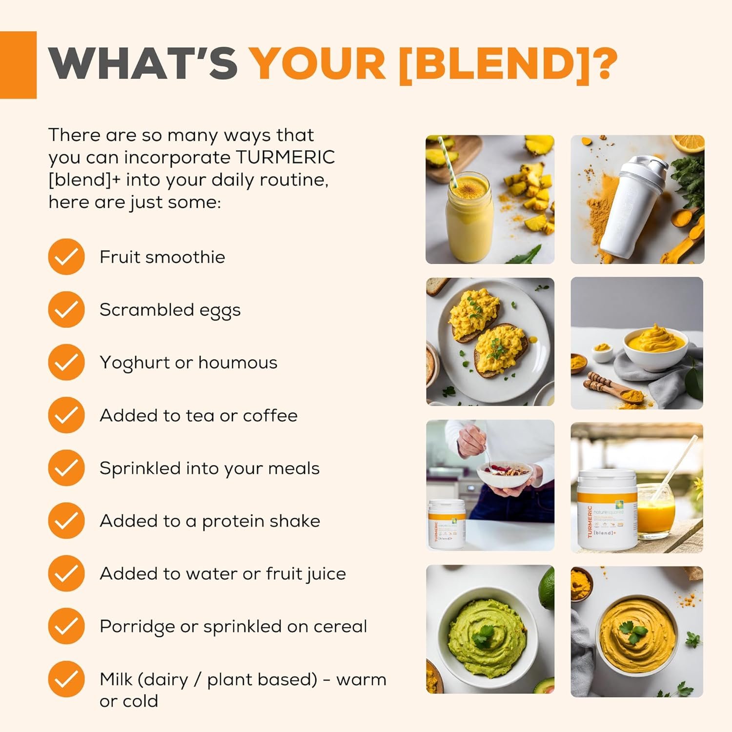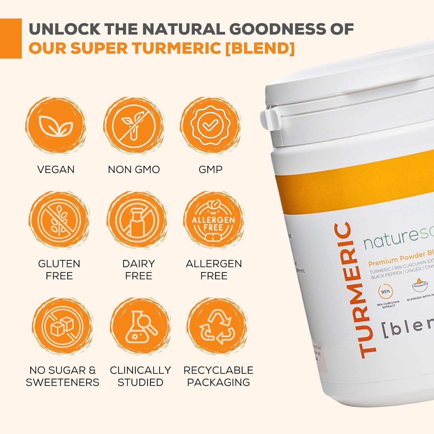 ENHANCED TURMERIC CURCUMIN BLEND WITH INCREASED ABSORPTION: TURMERIC [blend] is formulated with premium ‘health grade’ turmeric, boosted with a 95% curcumin extract, organic black pepper and the MCTs (medium chain triglycerides) from coconut oil. Enhanced with organic ginger, cinnamon, green tea & papaya to maximise the benefit. 1 teaspoon a day mixed into any food or drink.