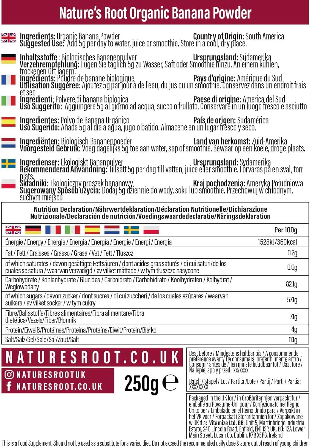 RAW ORGANIC BANANA POWDER: Made from sun-ripened organic bananas from the plantations of Peru, our banana powder is rich in flavour, packed with nutritional content, and free from all artificial colours, flavours, preservatives and additives.