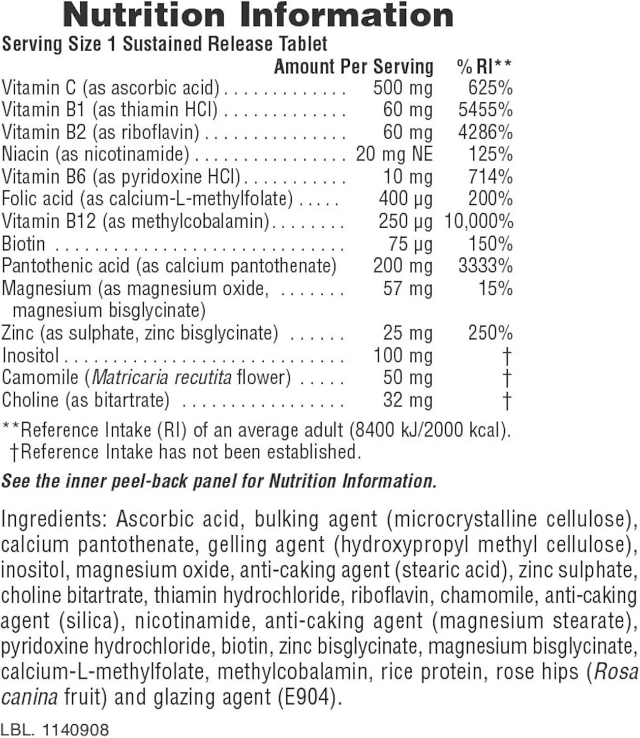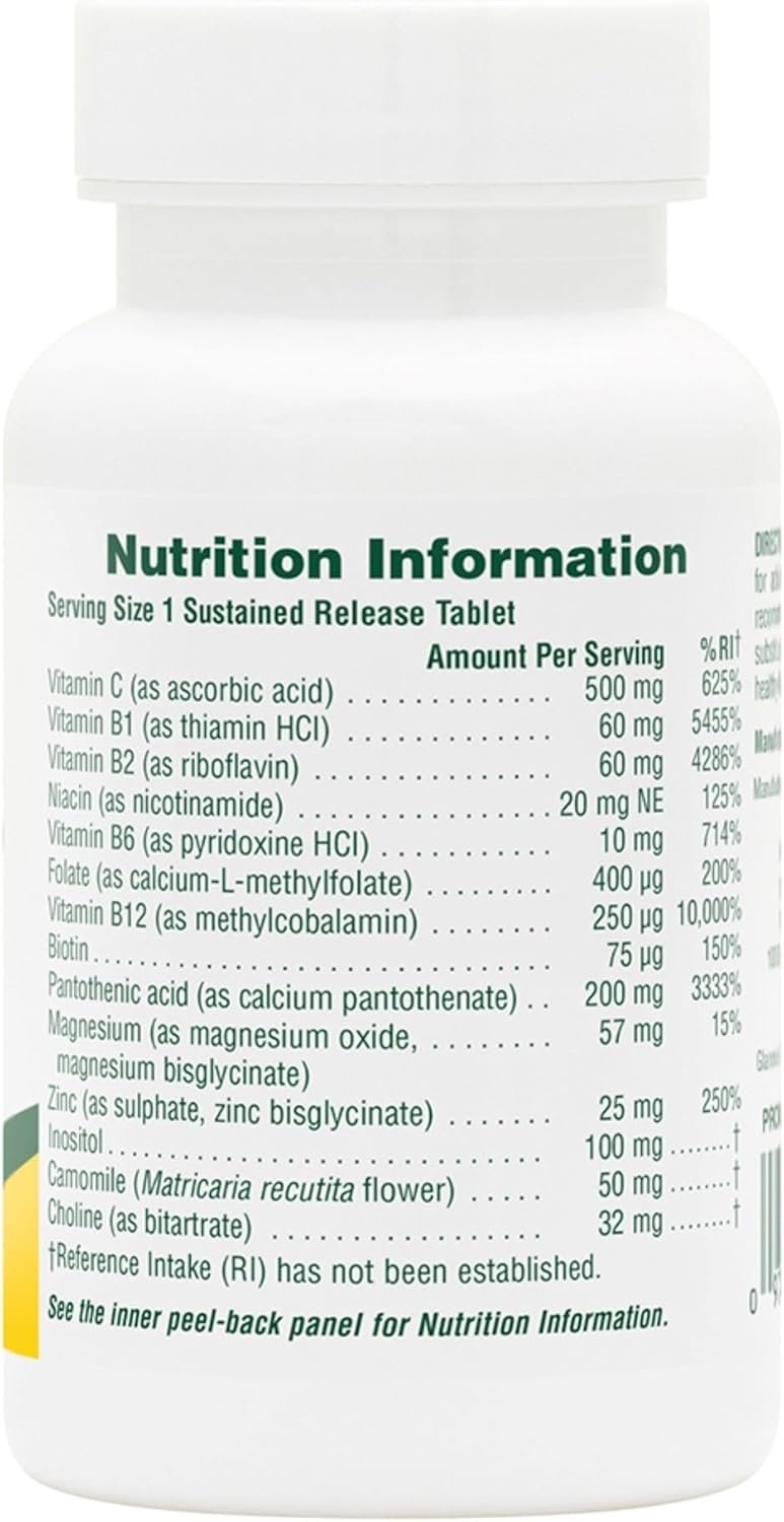 B VITAMINS, SYNERGISTIC HERBS AND NUTRIENTS: Chamomile, choline and inositol have been added for a more harmonising effect while B12 helps reduce tiredness and fatigue