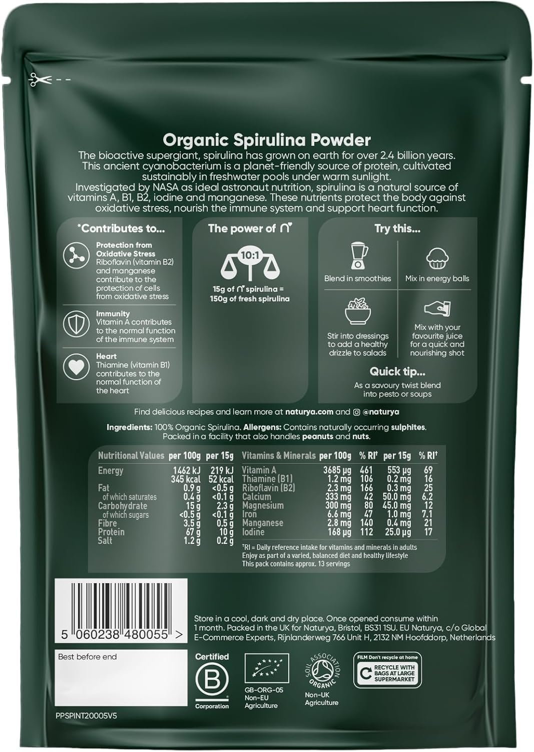 Naturya Organic Spirulina Powder 200g – Superfood Supplement for Energy, Immunity, & Detox – 100% Natural, Nutrient-Rich with High Protein & Iron, Non-GMO, Vegan-Friendly – Resealable Pack