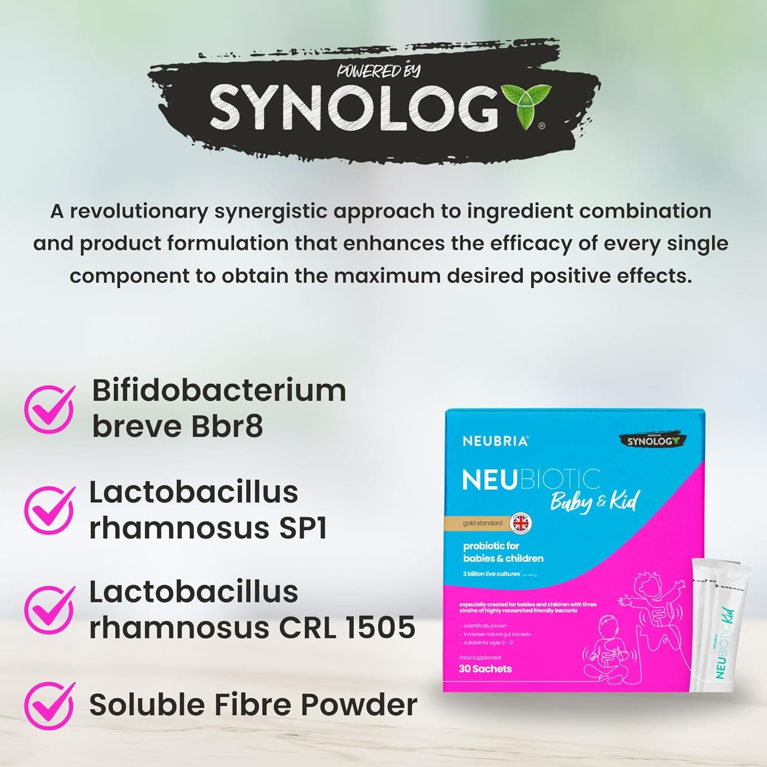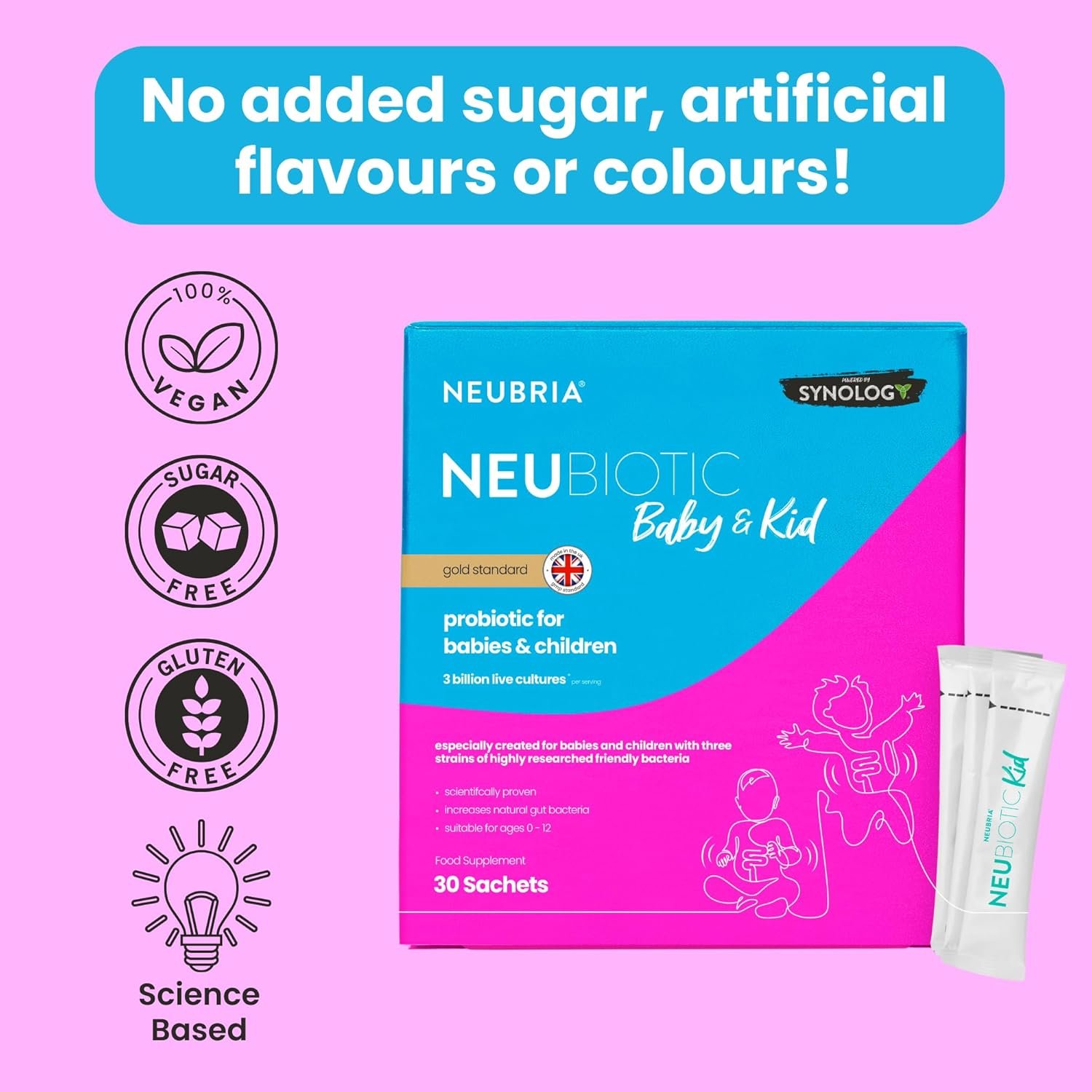 NEUBRIA NEUBIOTIC Baby & Kid – Children Probiotic & Prebiotic Supplement for Gut Health & Digestion – 3 Billion CFU Lactobacillus, Bifidobacterium & Fibres for Babies & Kids – UK Made – 30 Sachets