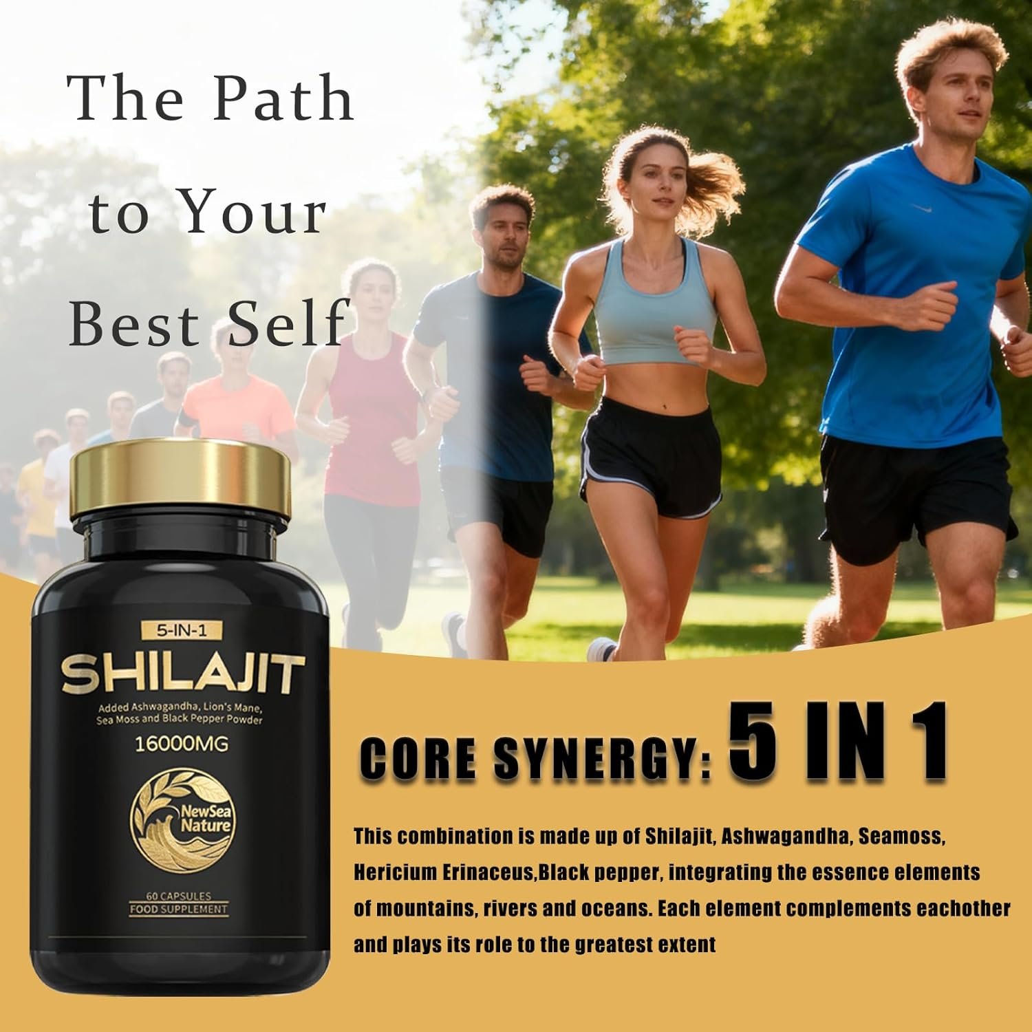 NewSeaNature Shilajit Capsules – 16000MG Premium Shilajit for Men – 5-in-1 with Ashwagandha 2000mg,Seamoss 2000mg,Hericium erinaceus 500mg,Black Pepper 35mg- 60 Capsules