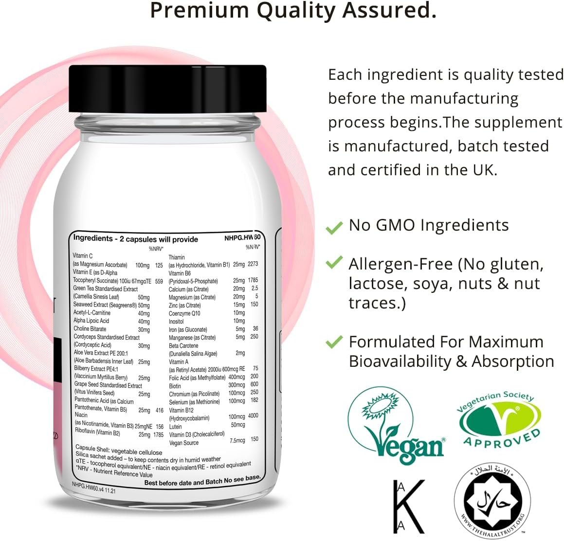 COMPREHENSIVE NUTRIENT PROFILE: Formulated with over 30 premium active nutrients, including essential vitamins, minerals, antioxidants, and plant extracts, to support women’s health and overall wellbeing.